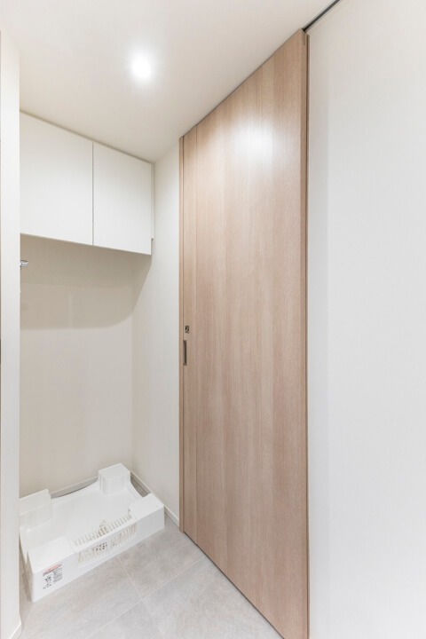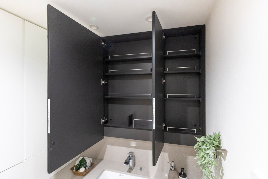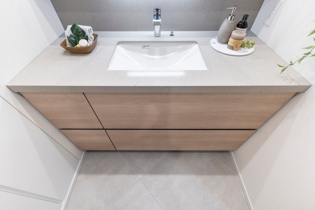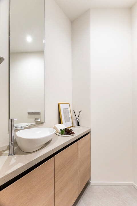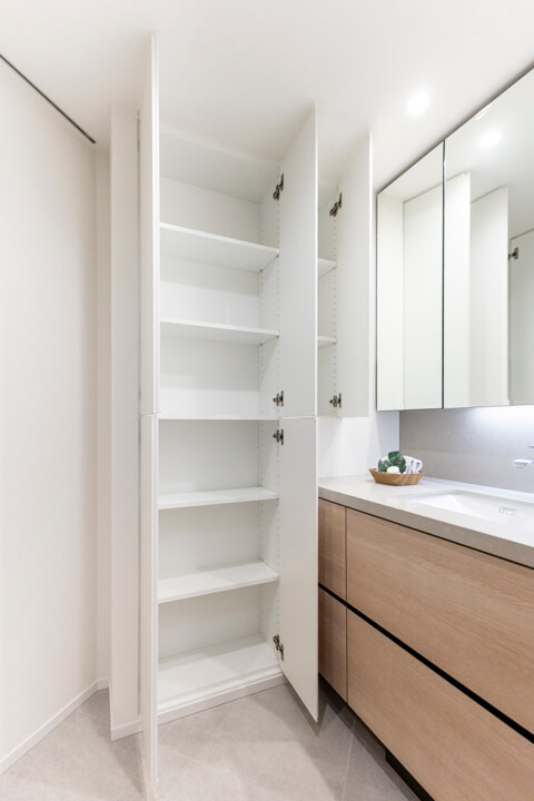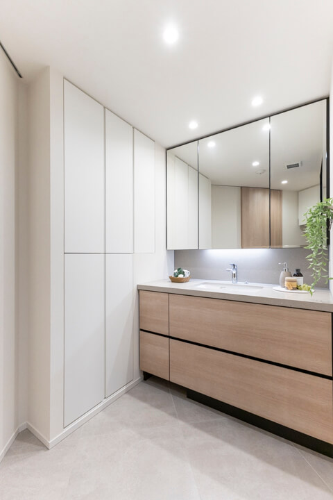 脱衣スペースを兼ねた洗面室。木目デザインがスタイリッシュな洗面化粧台が設置されています。大きな三面鏡付きで身だしなみを整えるのに便利。カウンタースペースにはゆとりがあり、化粧品やドライヤーの仮置きが可能です。洗面まわりの小物はミラーボックス、タオル・パジャマ類は左手のリネン庫に収納可能。いつも清潔な洗面室をキープできそうです。