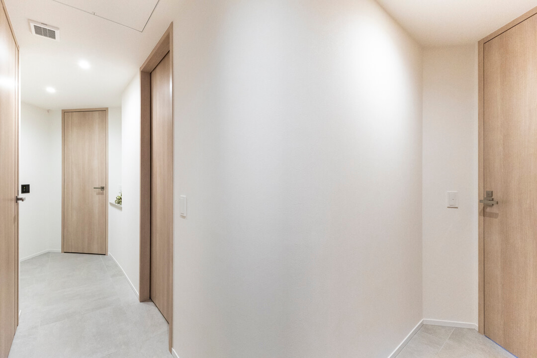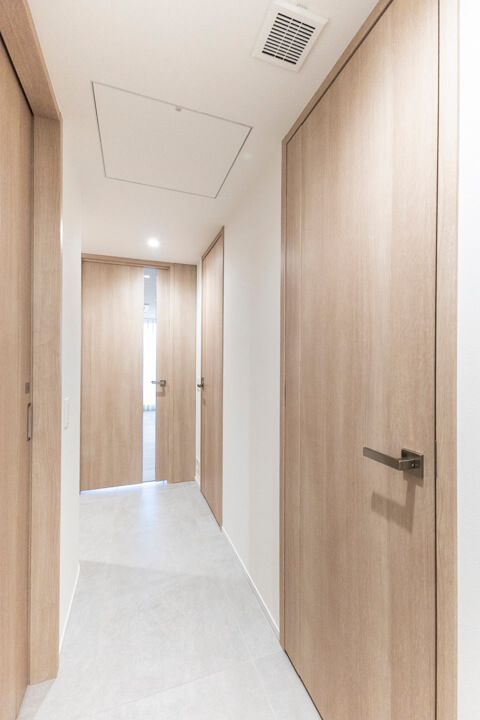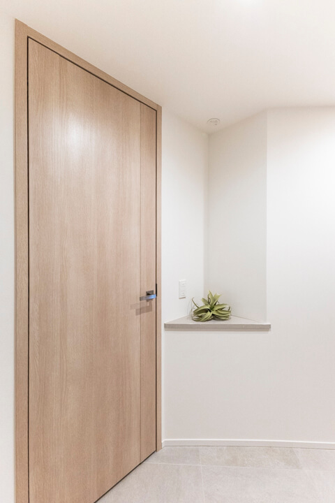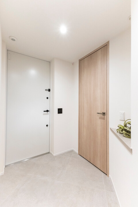 明るくナチュラルな雰囲気の玄関スペース。SIC(シューズインクローゼット)完備で散らかりがちな靴をすっきり収納できます。廊下にはマルチクローゼットがあり、コート類の収納に便利。お部屋に行く前に収納できるので、衛生面でも嬉しいです。
