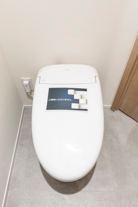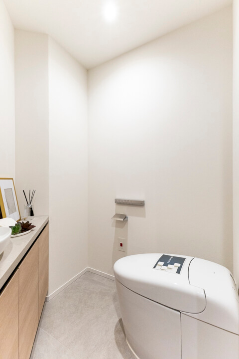 廊下に面していて独立性の高いレストルーム。TOTO製の洗浄機能付トイレを採用しています。丸みを帯びたタンクレス仕様ですっきりとした印象。手洗いカウンター付きなので、すぐに手を洗うことができて衛生的です。ゲストを洗面室まで案内する手間がかからないのも助かりますね。