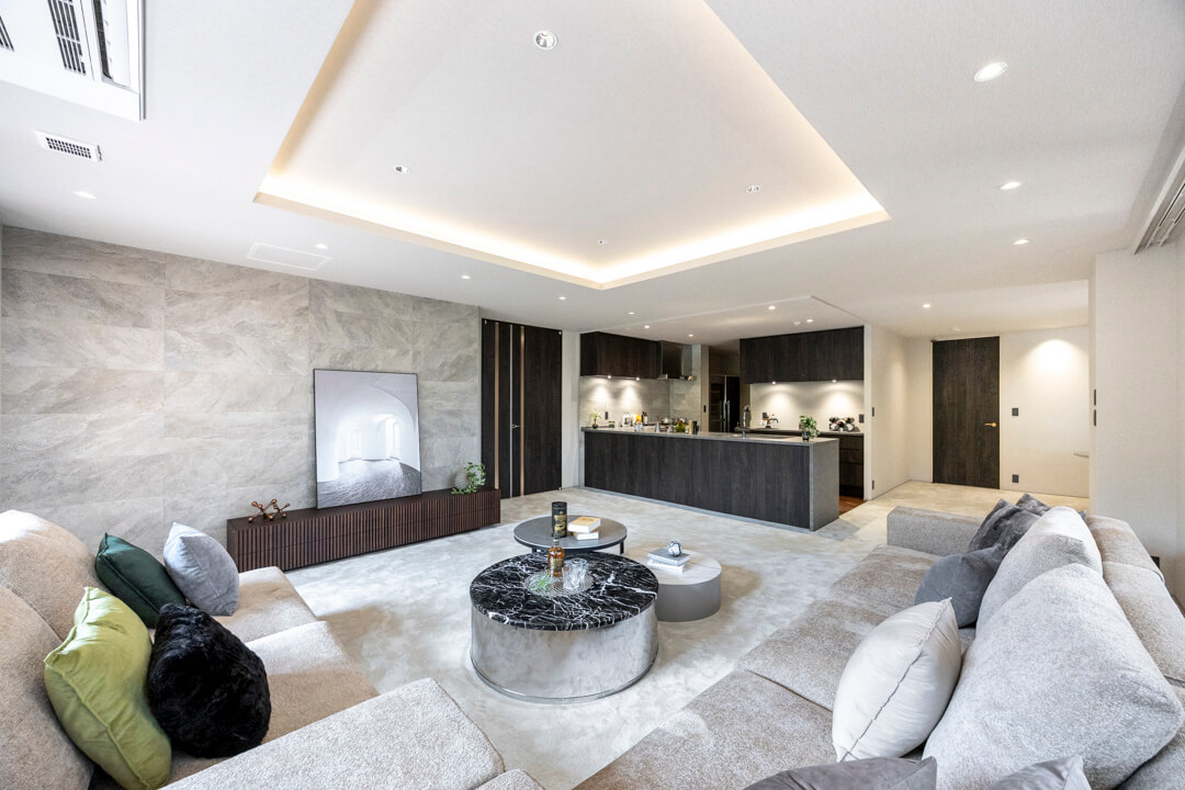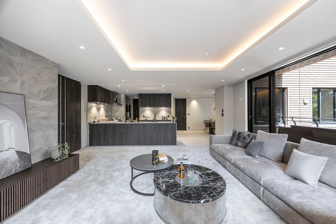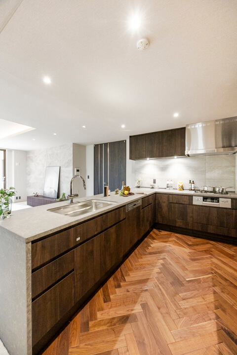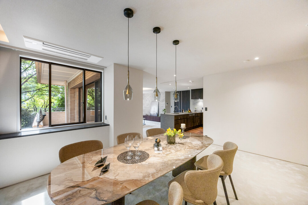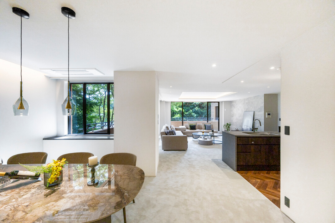 約40.2帖の広々と開放感のあるリビングダイニングキッチンです。リビングスペースとダイニングスペースがさりげなく空間分けされているので、それぞれの時間を堪能できます。二面採光で窓からは緑を感じる癒しの景色を楽しめます。また、玄関側の廊下と居室側の廊下両方にアクセスできる便利な動線にもなっています。