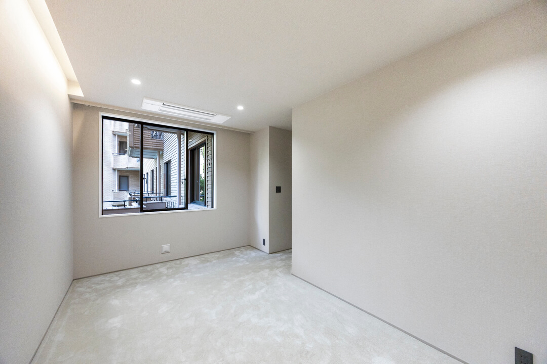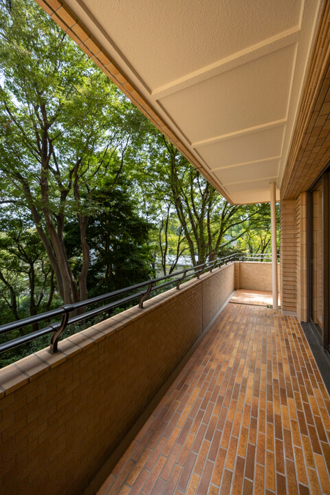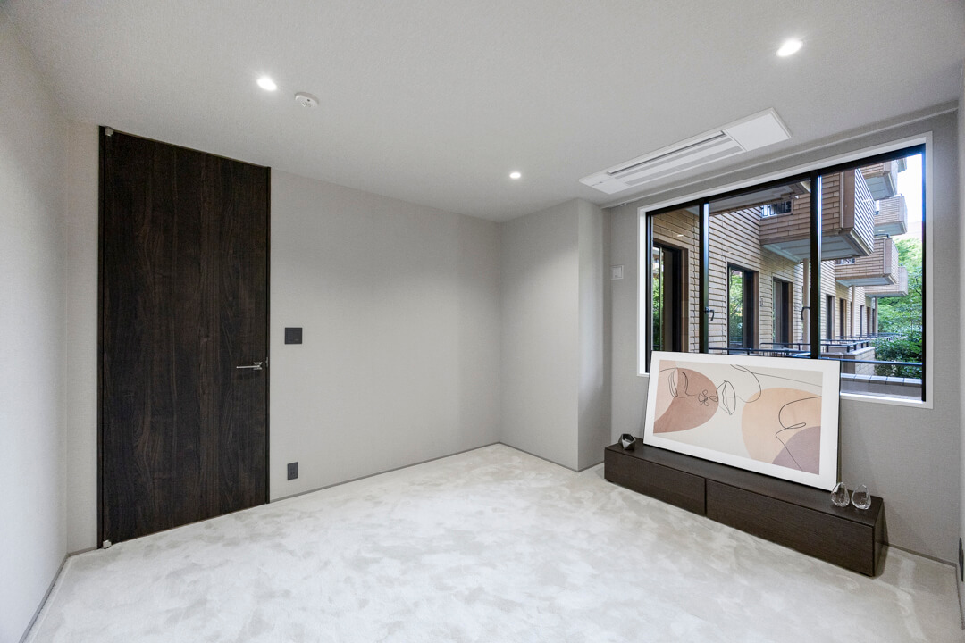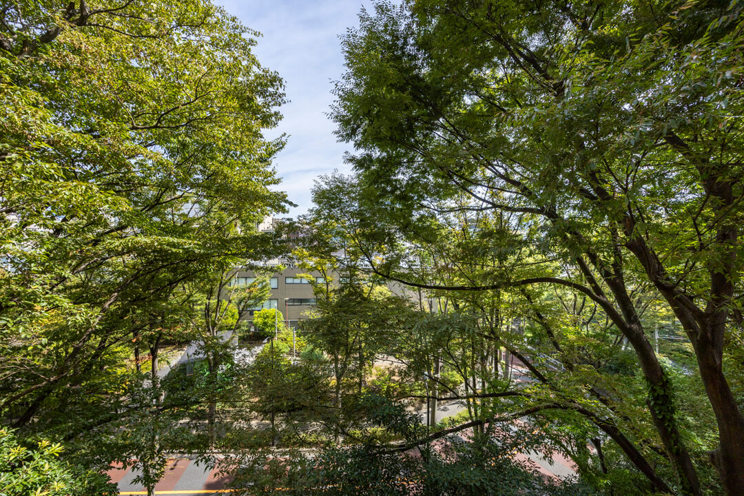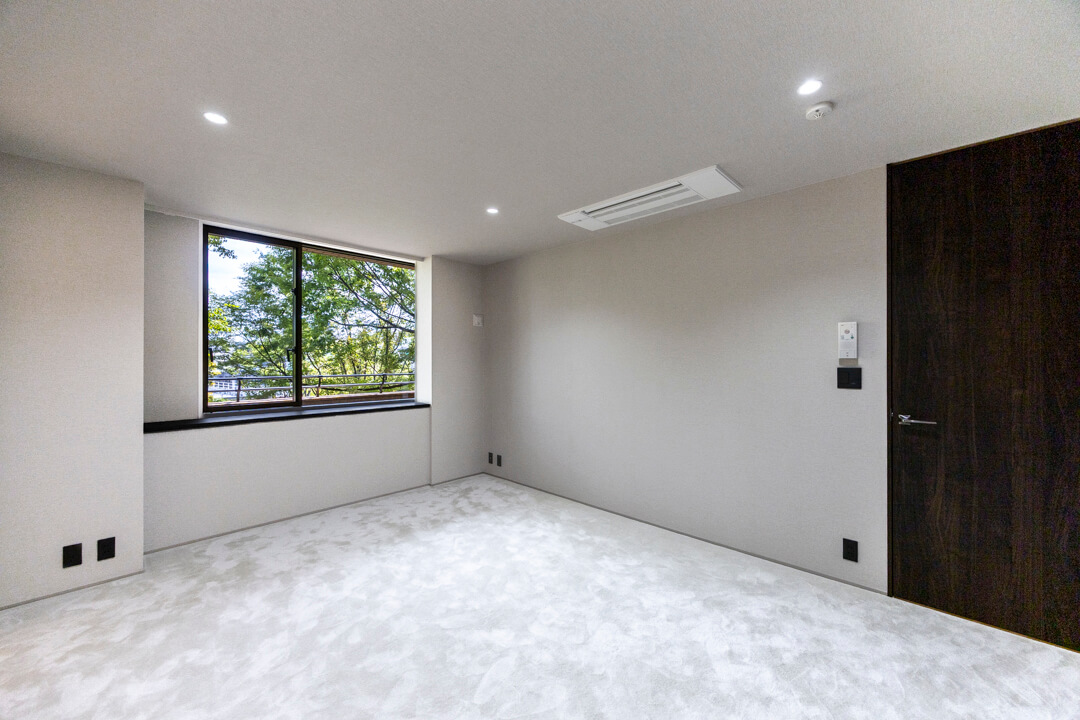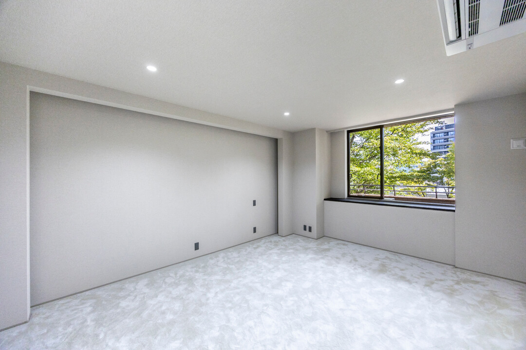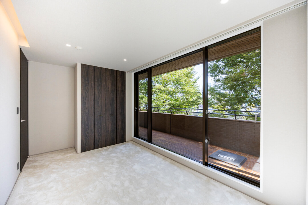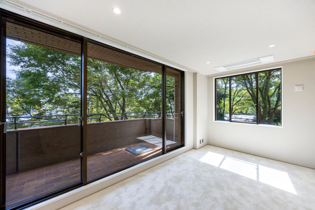 約8.3帖の洋室4は二面採光になっていて開放感があります。窓からは東側のバルコニーにアクセスができ、気分転換にも◎。美しい植栽の緑が楽しめます。
