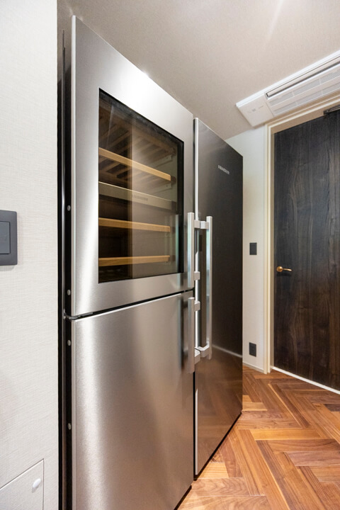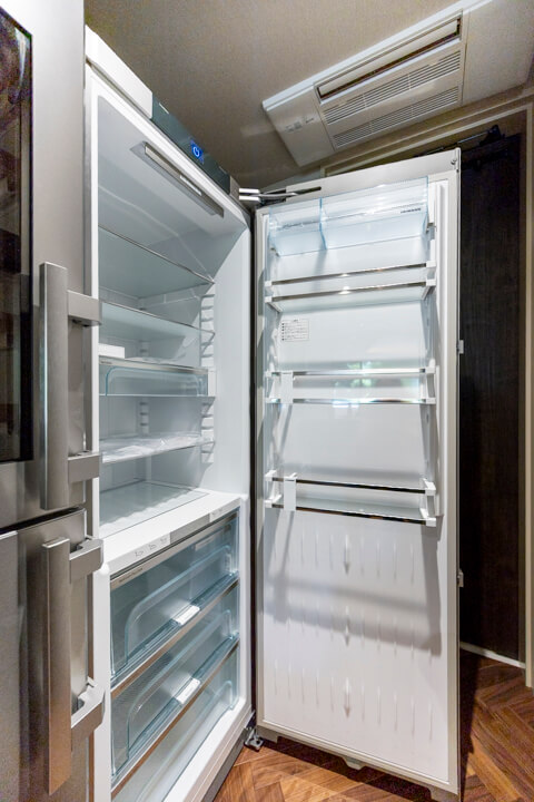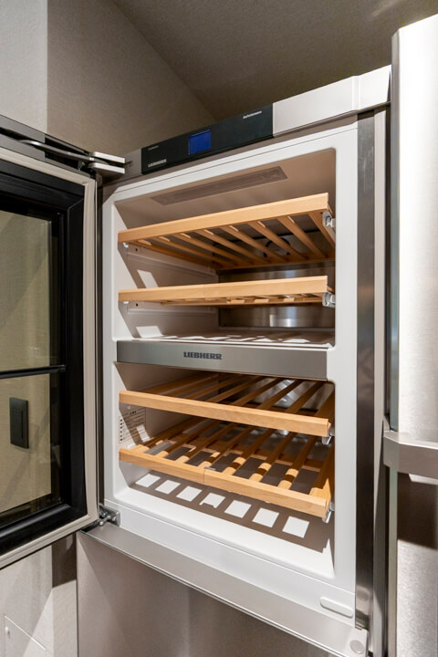 LIEBHERR製の冷蔵庫が設置されています。ドイツの家電メーカーで、機能が充実しているだけでなく、ヨーロッパらしいスタイリッシュなデザインも魅力的です。BioFresh(バイオフレッシュ)という機能が搭載されており、食材ごとに最適な温度・湿度を保つことができます。消臭効果のある、FreshAir活性炭フィルター付きで、新鮮な空気を庫内に供給できますよ。さらに、ワインセラーも付いています。複数のゾーン毎に5〜 20℃の温度範囲から1℃単位で設定が可能です。また、SmartDevice対応の冷蔵庫のため、アプリと連携させると遠隔で温度管理やドアが開いたままになっているなどのステータスメッセージも受け取ることができます。