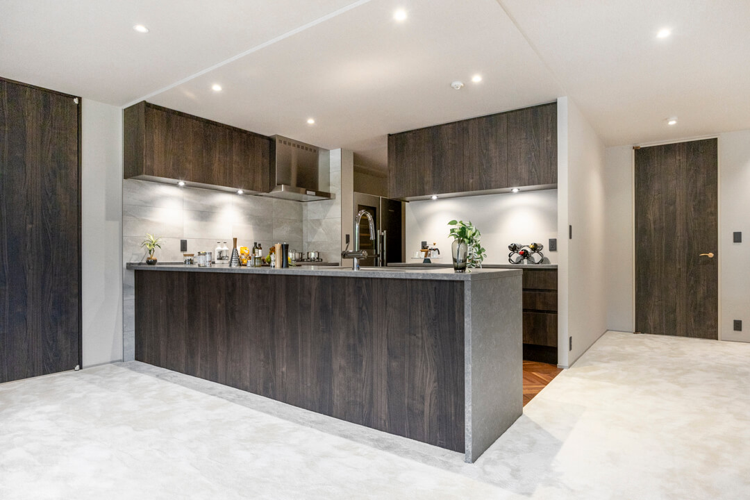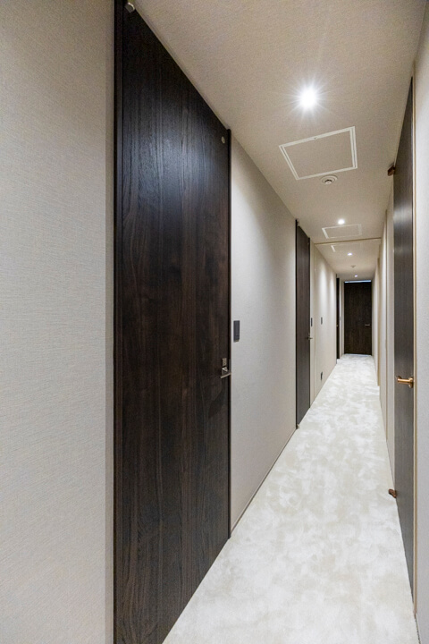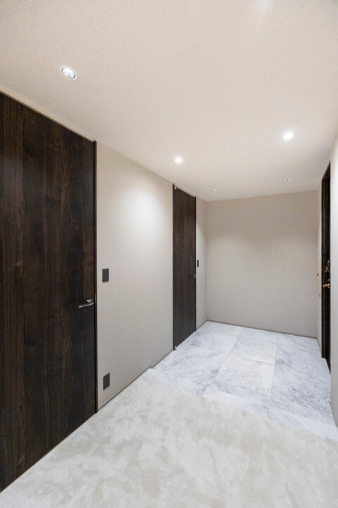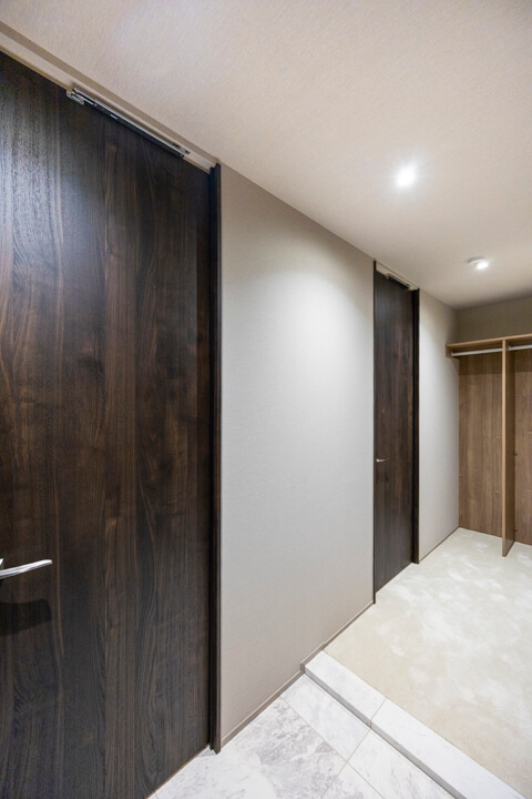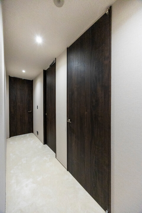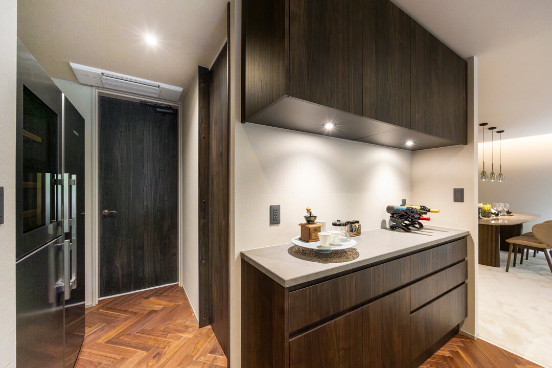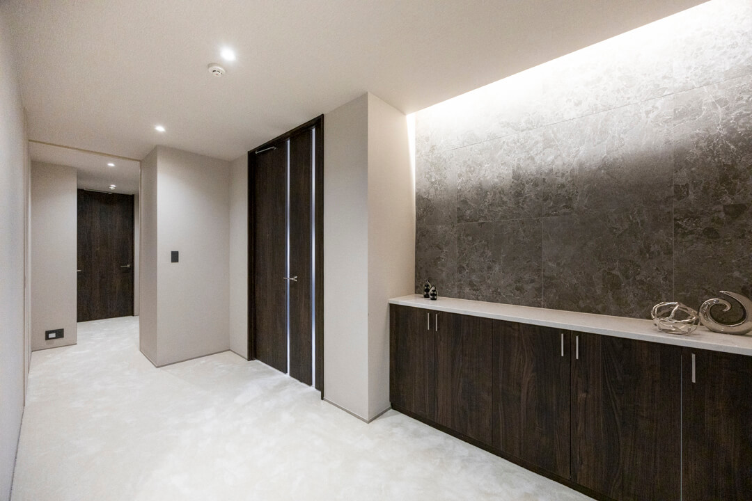 廊下にはカウンター収納が造られています。小物を収納できるだけでなく、グリーンやアロマまどを飾ることもできて◎。また、居室側への廊下とは扉で仕切られているので、プライベートを大切にすることができます。来客時にも生活感を隠すことができて嬉しいですね。