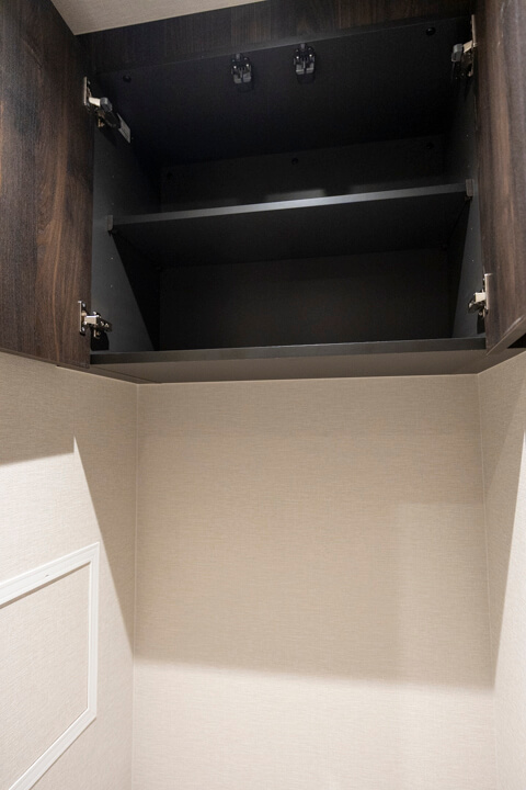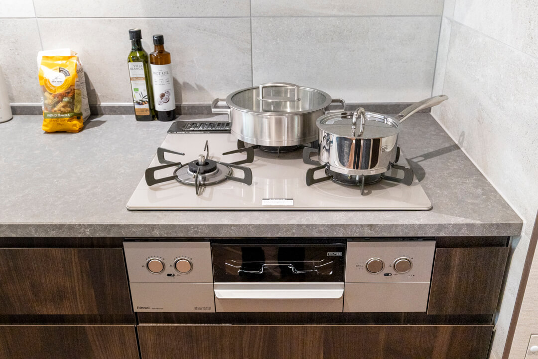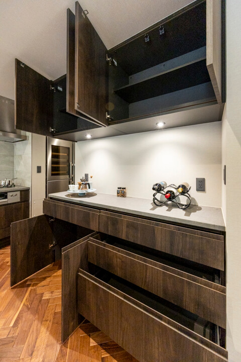キッチンの背面側にはカップボードが備え付けられています。調味料や食器などを収納できるだけでなく、電子レンジなどを置くこともできるので便利です。