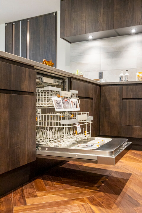 ドイツの高級家電ブランドMiele(ミーレ)製の大型食洗機です。大きなサイズ感でパーティーや来客時での後片付けの負担を大幅に軽減してくれます。また、静音設計でマンションでも嬉しく、省エネ性能にも優れていますよ。
