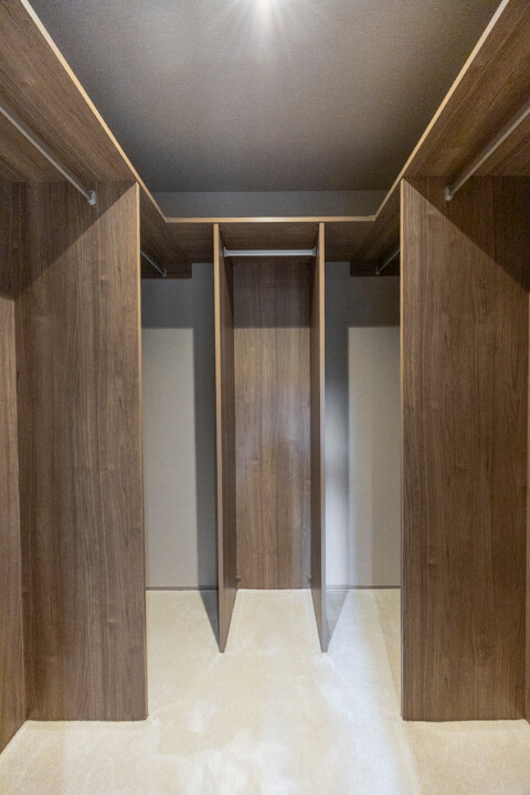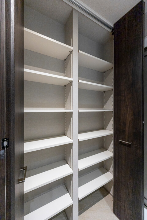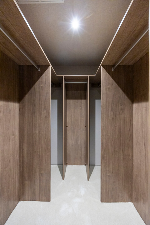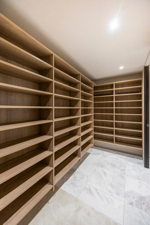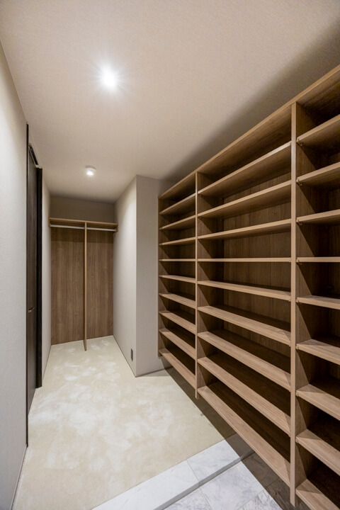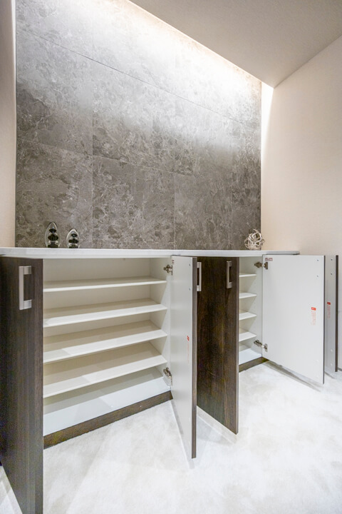 ゆとりのある玄関で、スーツケースやベビーカーなど大きめの荷物を持っていても出入りがしやすそうです。シューズインクローゼットは2ヶ所から出入りができる便利な動線。たくさんの靴やアウトドアグッズなども収納できます。