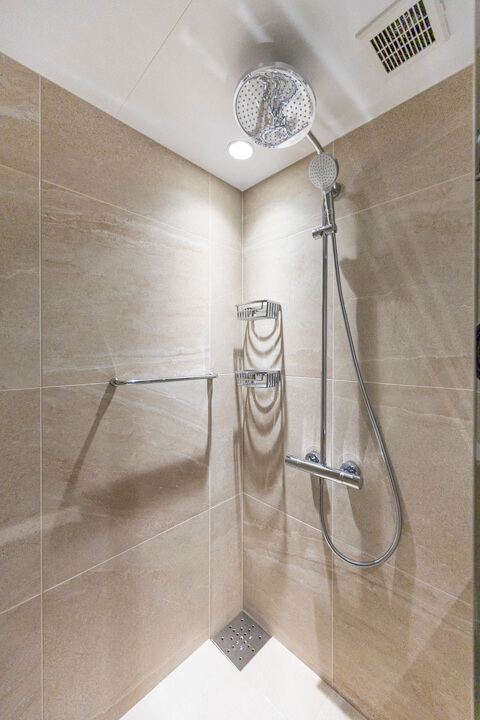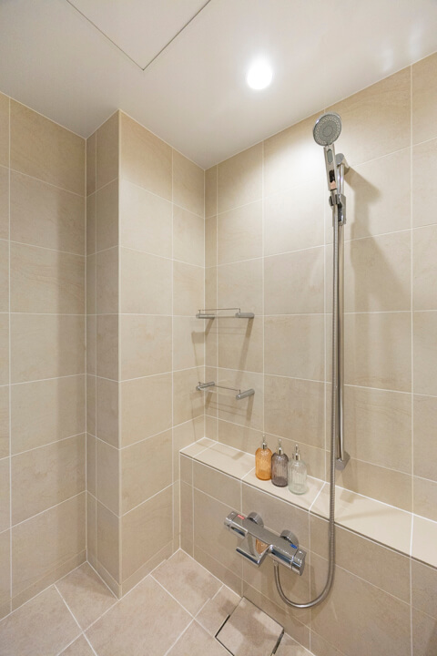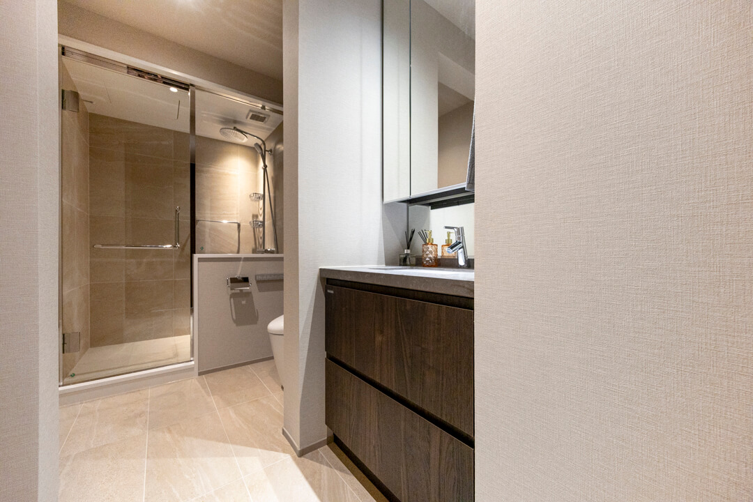 約9.3帖の広々とした洋室1は主寝室に良さそうなお部屋です。奥行きがあるウォークインクローゼット付きで、たくさんの洋服が収納可能。さらに、洗面化粧台・トイレ・シャワールームがあるため、朝の支度も時短が叶います。また、シャワールームにはオーバーヘッドシャワーが付いており、たっぷりと全身で湯を浴びることができます。リラックス効果や保温効果もあって◎。