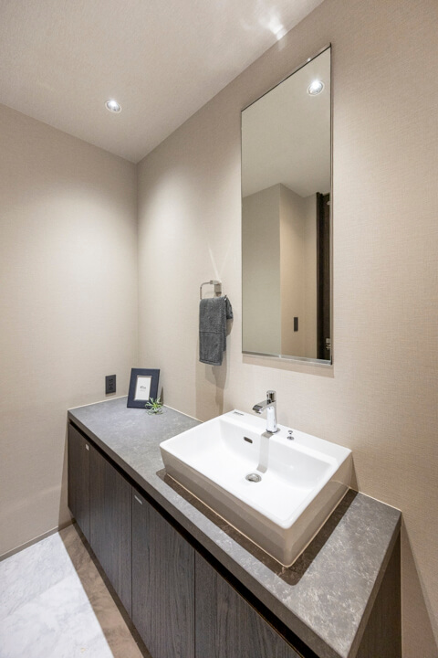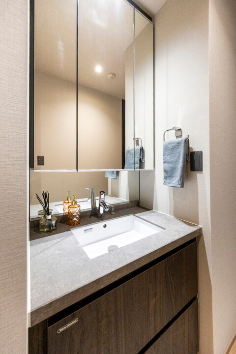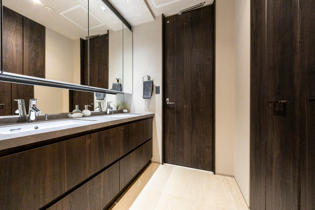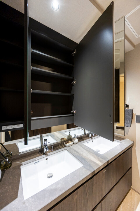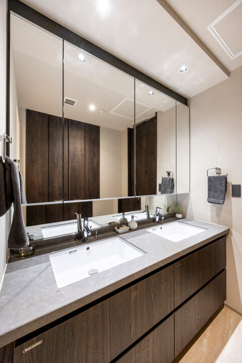 ホテルライクな2ボウル洗面の化粧台です。忙しい朝でも並んで支度ができて便利。大きなミラーボックスの中には化粧品などが収納できて使い勝手が良好です。背面側にはリネン庫があり、ごちゃごちゃしがちな洗面まわりをすっきりと整頓させることができます。