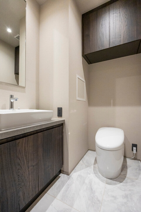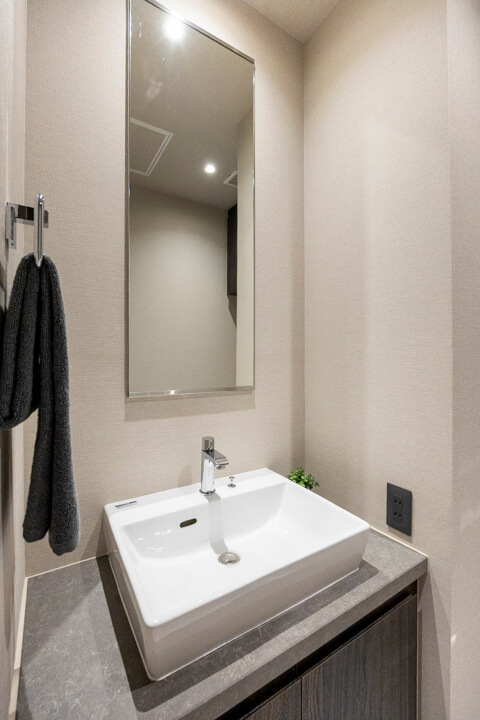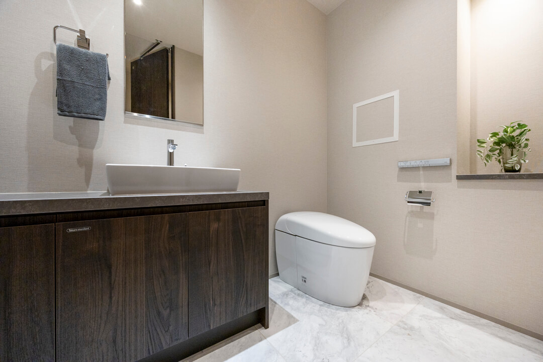 トイレは、玄関側の廊下と居室側の廊下の2ヶ所に造られています。来客用とプライベート用とで使い分けることもできるので便利ですね。どちらにも、手洗い器が設置されているので、その場でサッと身だしなみを整えることができます。