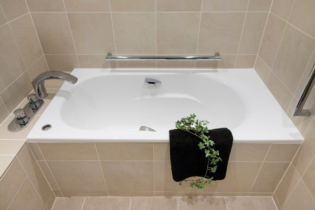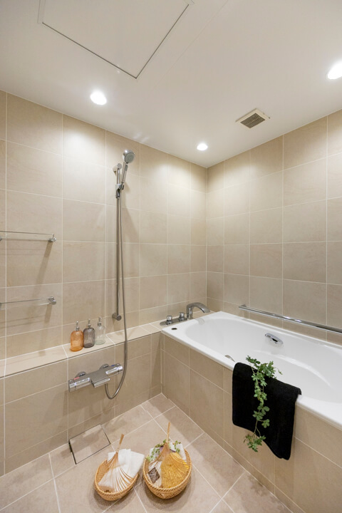 ベージュトーンで落ち着いた雰囲気のバスルームです。ゆとりがある広さなので、ゆったりと入浴することができそうですよ。また、浴槽側には手摺が設置されているので、立ち上がりもしやすくなっています。