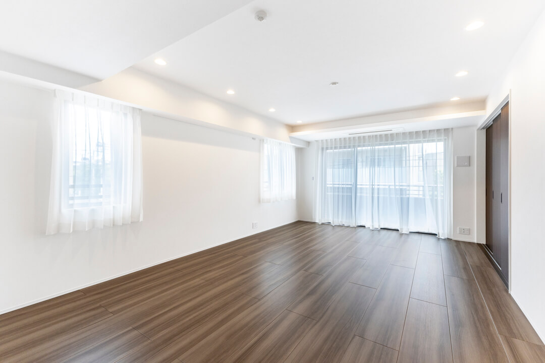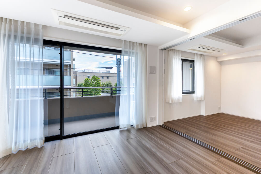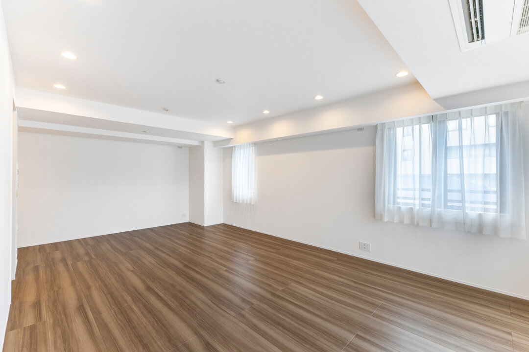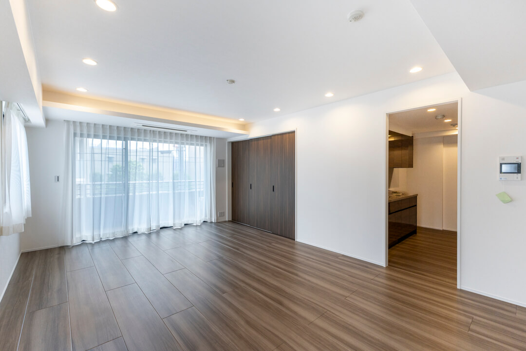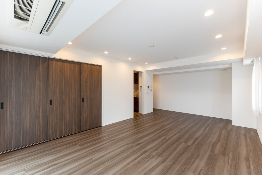 約22.2帖のLDK。最高天井高2.4mの開放的な空間です。北東2面採光で明るく、風通しの良さも魅力的。エアコンにはすっきりとした見た目のビルトインタイプが採用されていて、奥行きをもたらします。