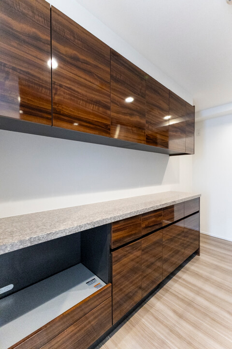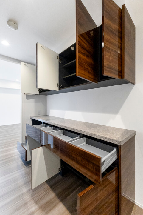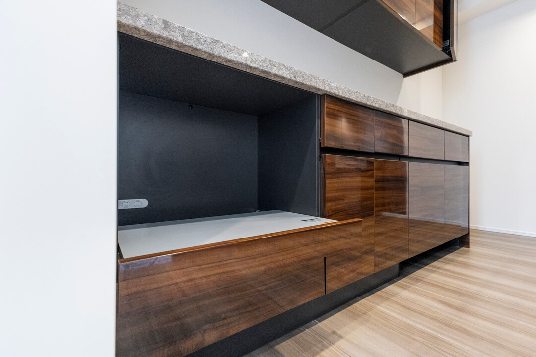 背面には収納力のあるカップボードを完備。キッチンと同じデザインで統一感があります。食料品のストックや食器類を整理整頓でき、ごちゃごちゃしがちなキッチンまわりがすっきり片付きそうですね。引出し可能なトレイボードにはコンセントが付いていて、キッチン家電の使用に便利です。