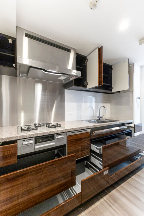 グリル付3口ガスコンロ・食洗機内蔵で調理も後片付けも捗ります。さらに、シンクにはディスポーザーを搭載。生ごみ処理の手間が軽減され、悪臭の原因を防いでくれます。