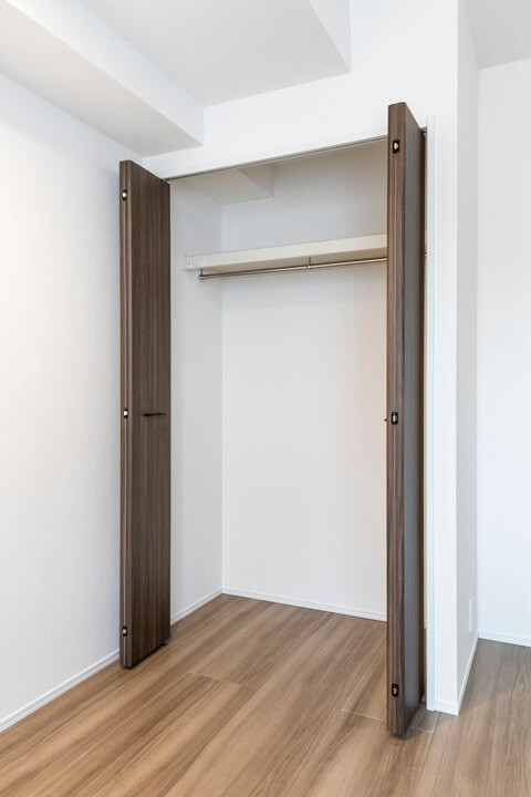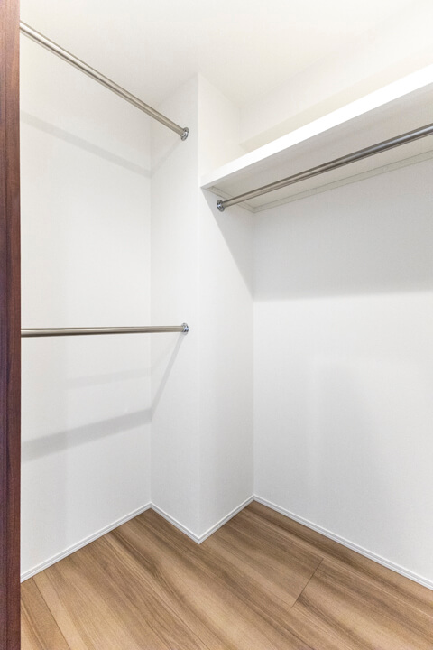 WIC(ウォークインクローゼット)完備で収納力◎。衣類はもちろん、トランクケースやゴルフバッグといった大きな荷物も収納でき、居室空間を広々と使うことができます。ハンガーパイプが2段になっていて、丈の短い洋服を効率良く収納できるのもポイントです。