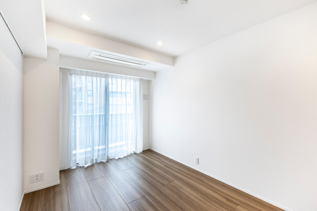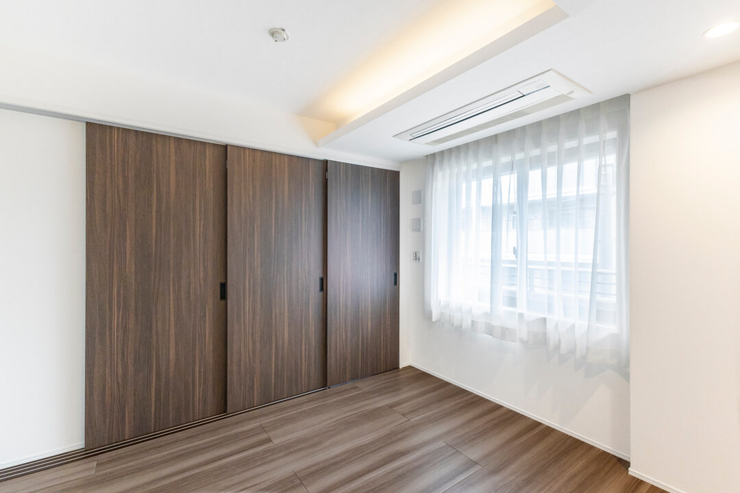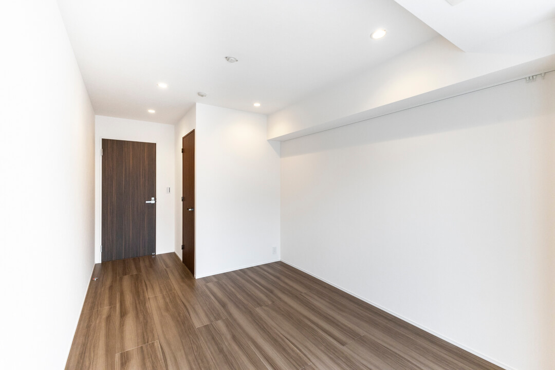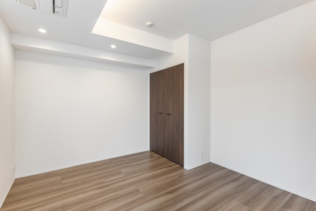 LDKに隣接する寝室3。約6.5帖です。LDKとは引き戸で仕切られているので、フレキシブルに活用できます。扉を開放して拡張リビングにしたり、閉めてワークスペースやプライベート空間にしたり。ライフスタイルやシーンに合わせて使い分けてくださいね。クローゼット完備で収納スペースもしっかり確保◎。リビング同様、床暖房付きなのも嬉しいポイントです。