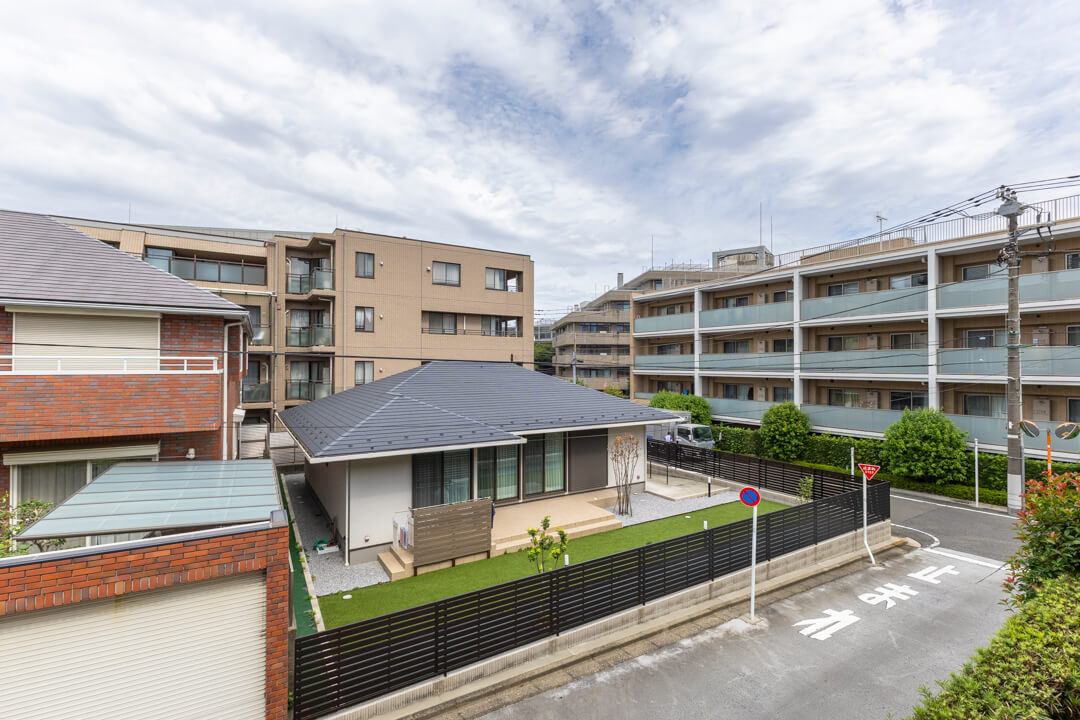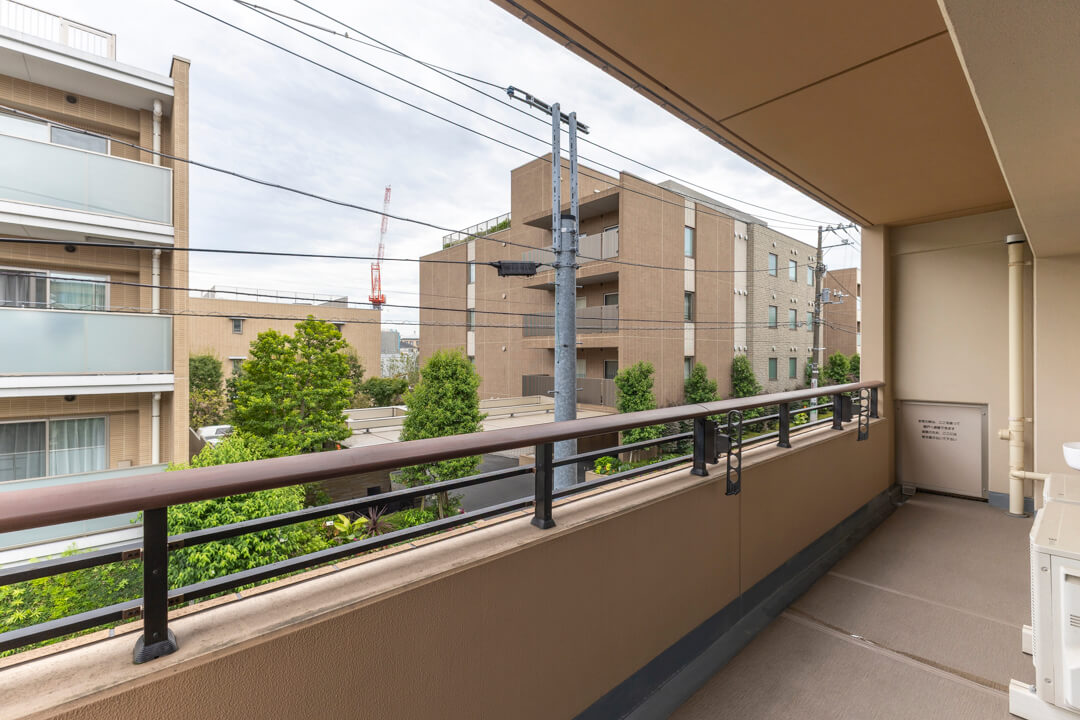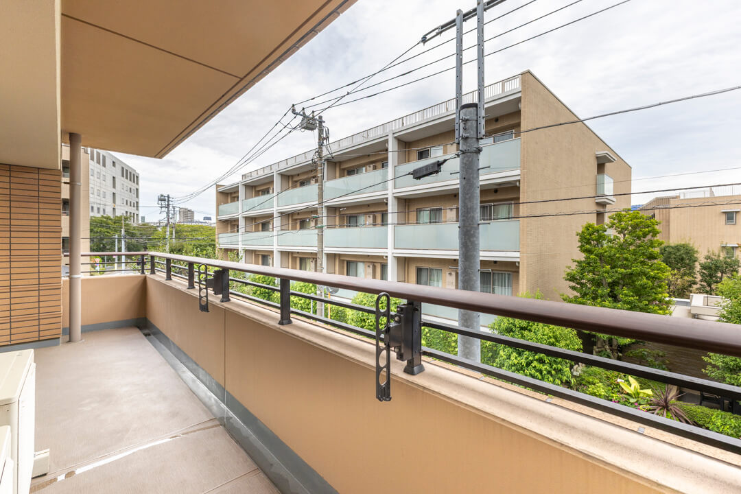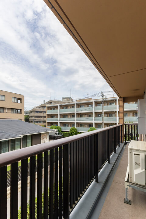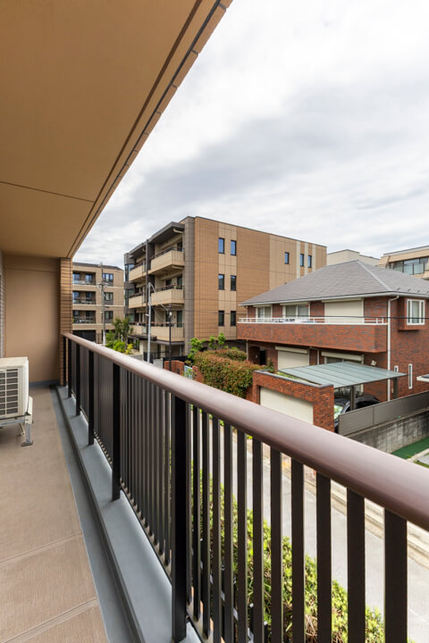バルコニーは東側と北側の2ヶ所にあり、各居室に面しています。合計22㎡ほどの広々とした空間。第二種低層住居専用地域に位置している為、周辺は低層の建物が多く、穏やかな眺めです。植栽の緑が見えるのも嬉しいポイントです。リビング側の東向きバルコニーにはスロップシンクがあり、靴やアウトドア用品を洗ったり、お花の水やりに便利です。