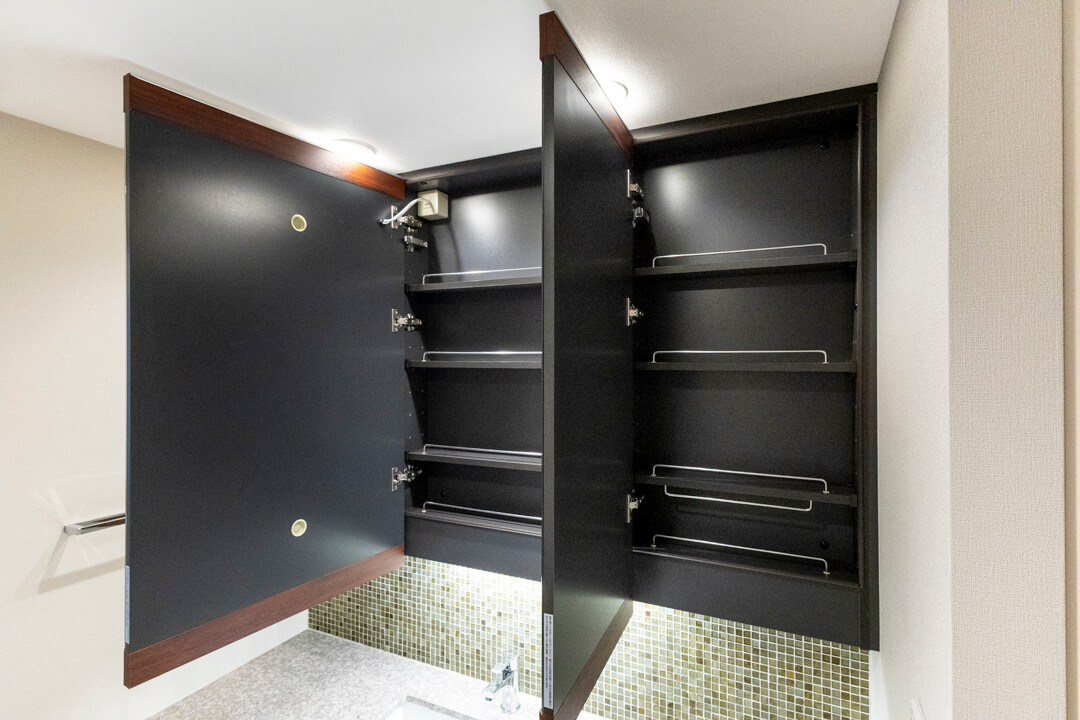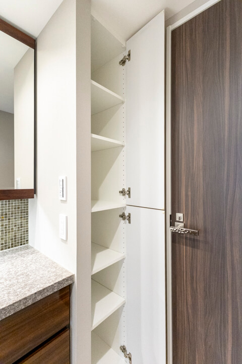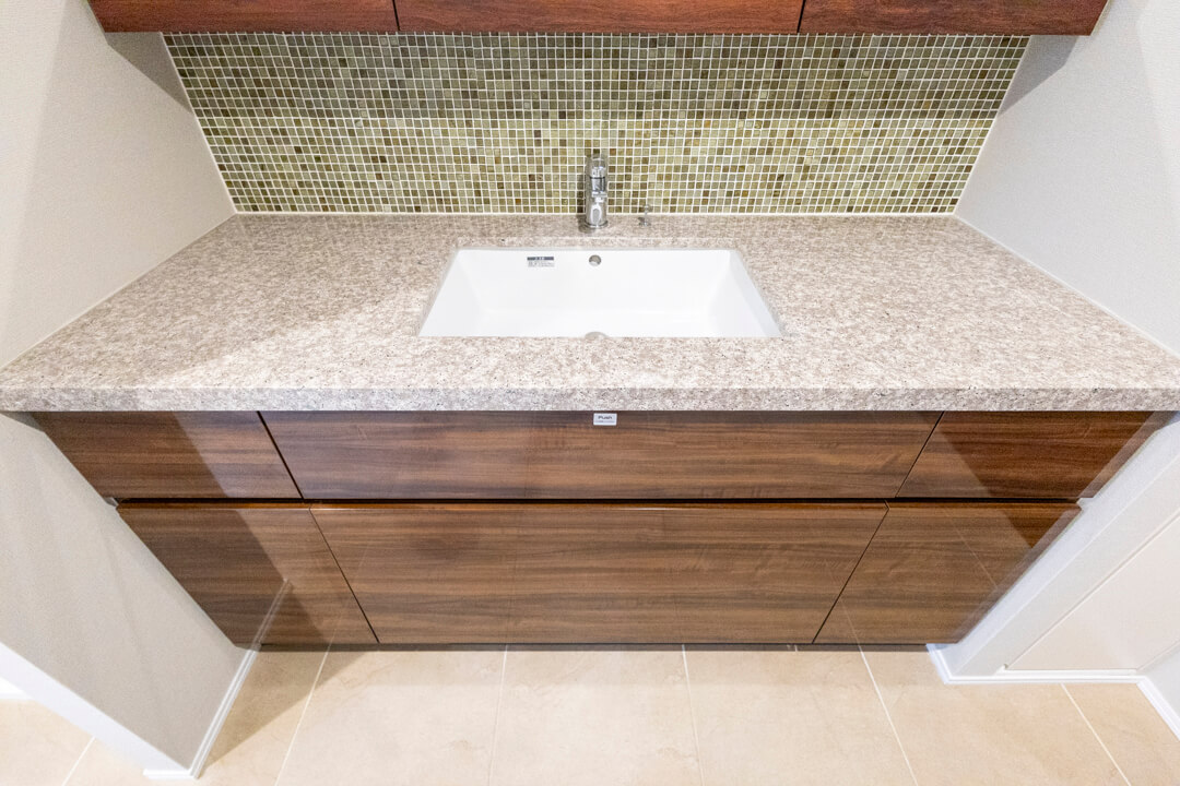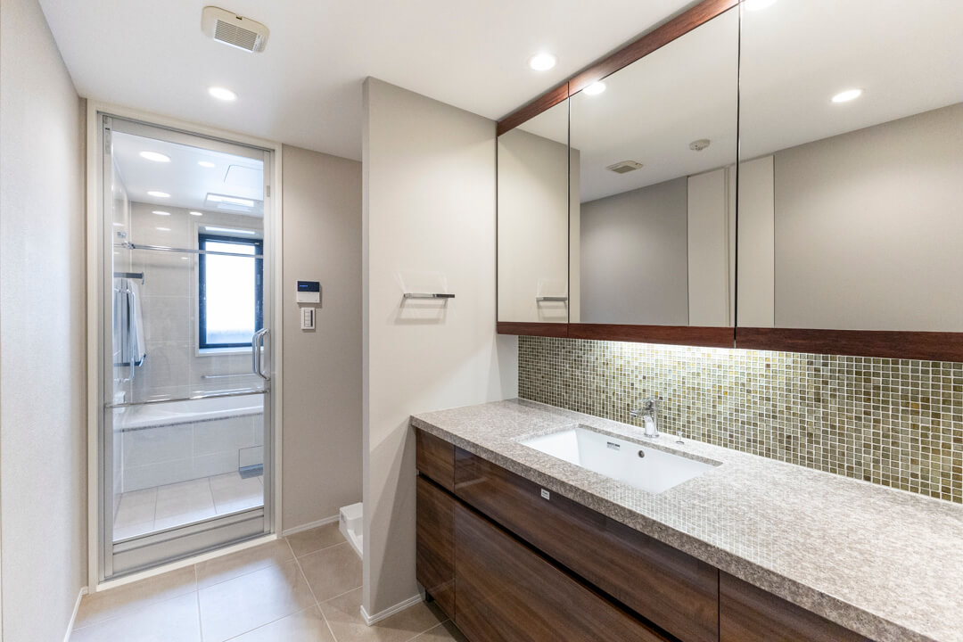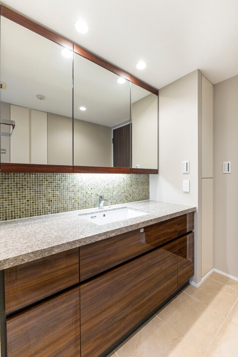 バックガードのモザイクタイルが高級感を演出する洗面化粧台。大きな三面鏡付きで身だしなみを整えるのに便利です。間接照明が手元を明るく照らしてくれるのも嬉しいポイントです。カウンタースペースにはゆとりがあり、化粧品やドライヤーの仮置きが可能。ミラーボックス・足物との引出しに加え、リネン庫も完備していて、収納スペースが充実しています。