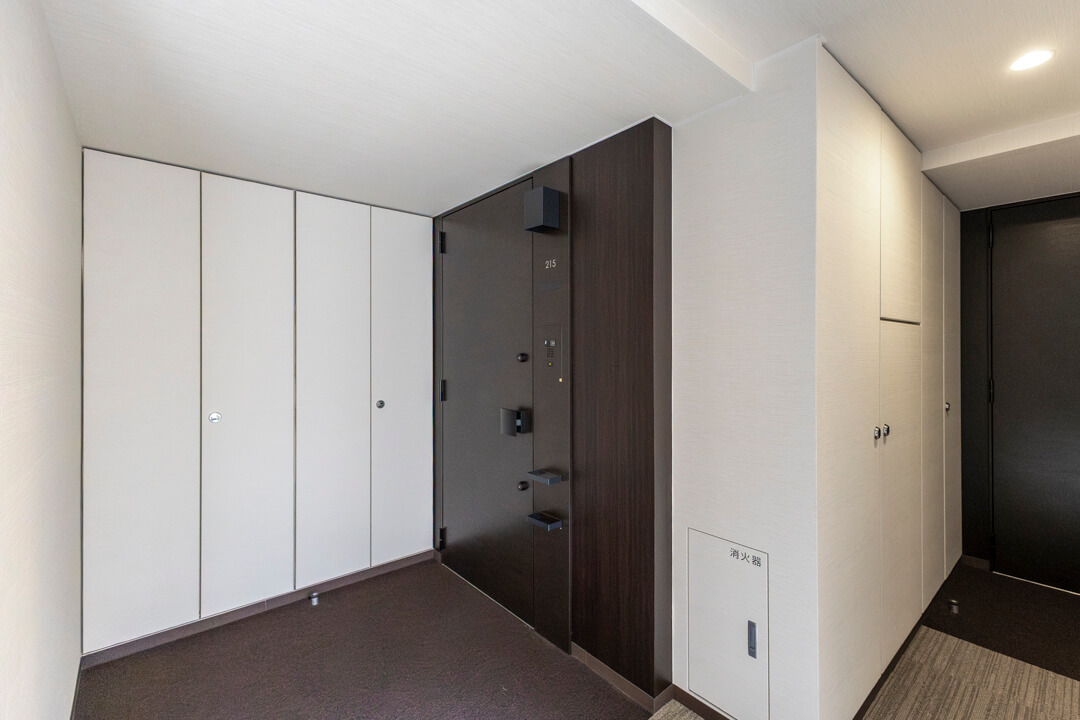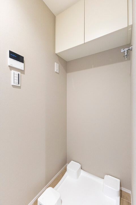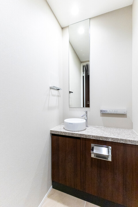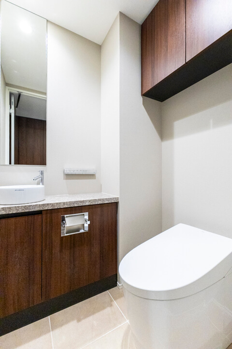廊下に面していて独立性の高いレストルーム。TOTO製の洗浄機能付トイレに交換済みです。タンクレス仕様でスタイリッシュ。便フタは自動開閉式なので、直接触れることなく使用できて衛生的です。手洗いカウンター&吊戸棚備え付けで使い勝手の良い空間です。