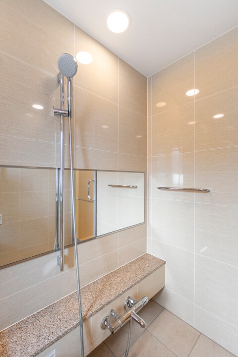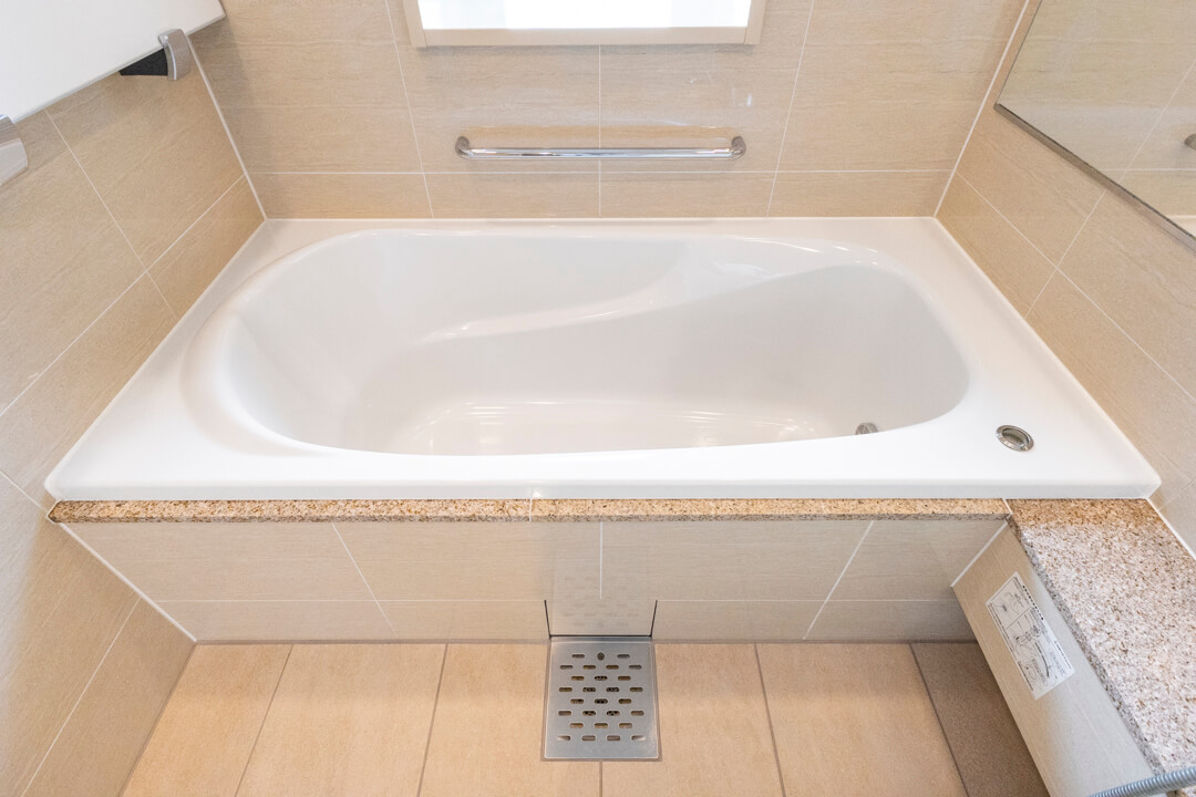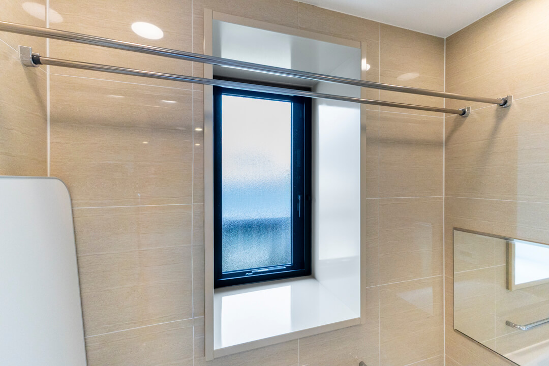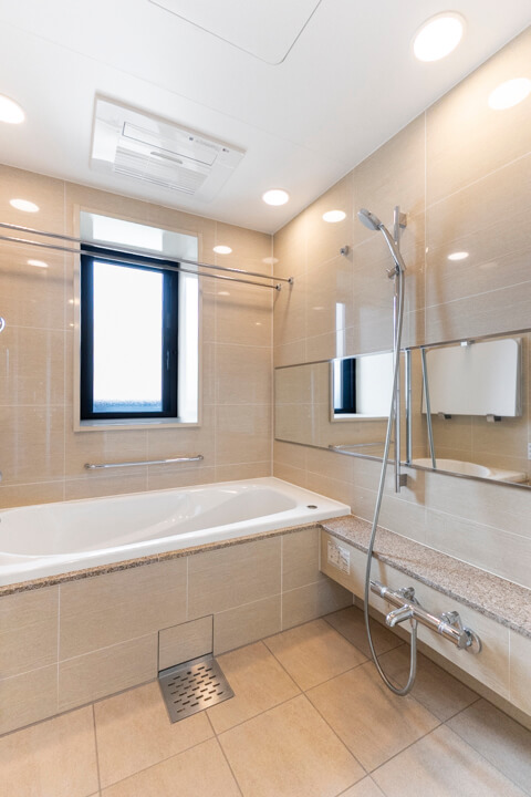 バルコニーに面する窓から明るい光が入るバスルーム。自然換気できるのも嬉しいポイントです。ワイドミラーが奥行きをもたらし、広々とした印象に。換気・暖房・乾燥・涼風機能付きで1年中快適なバスタイムを過ごせます。追い焚き機能も付いているので、家族の入浴時間がずれてしまった時、半身浴をしたい時に重宝しそうです。