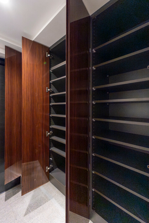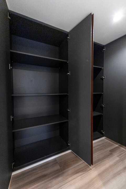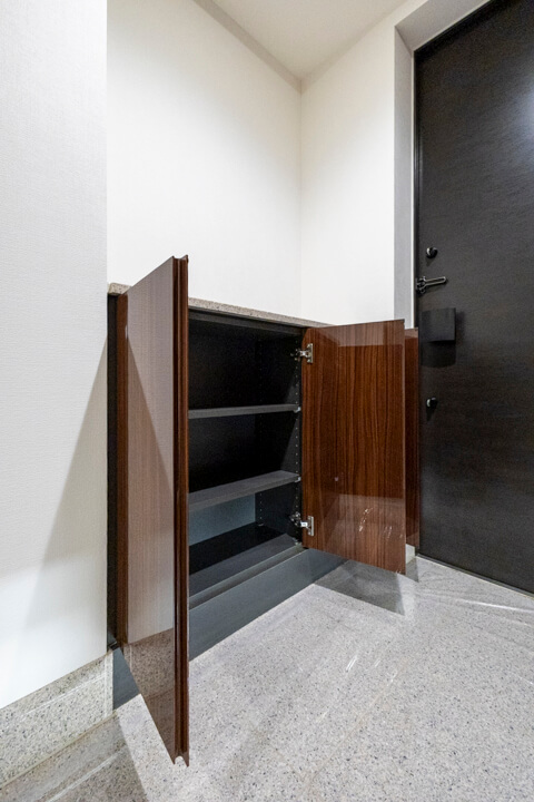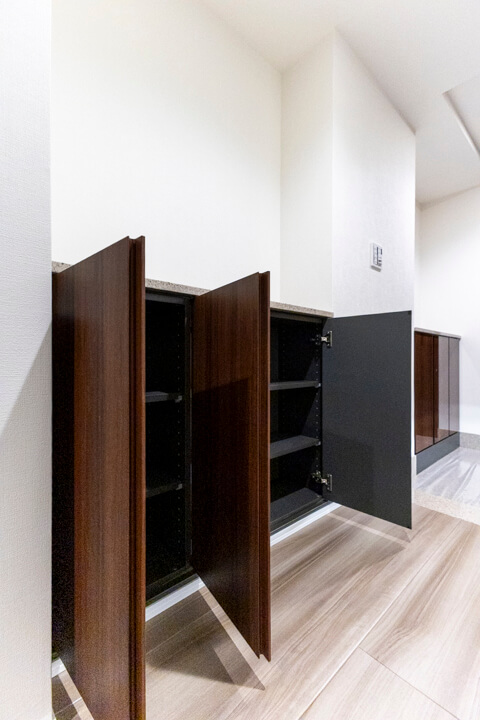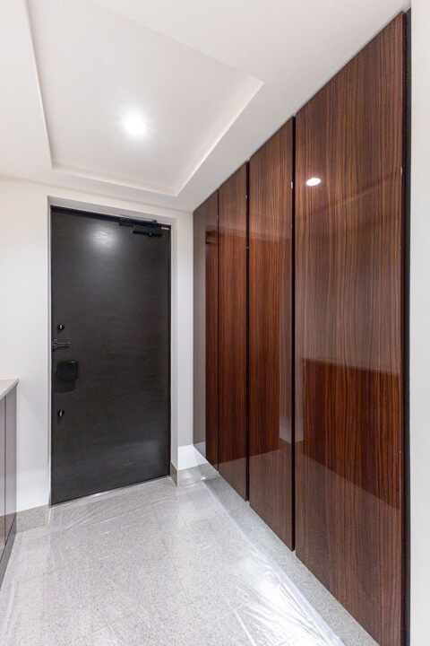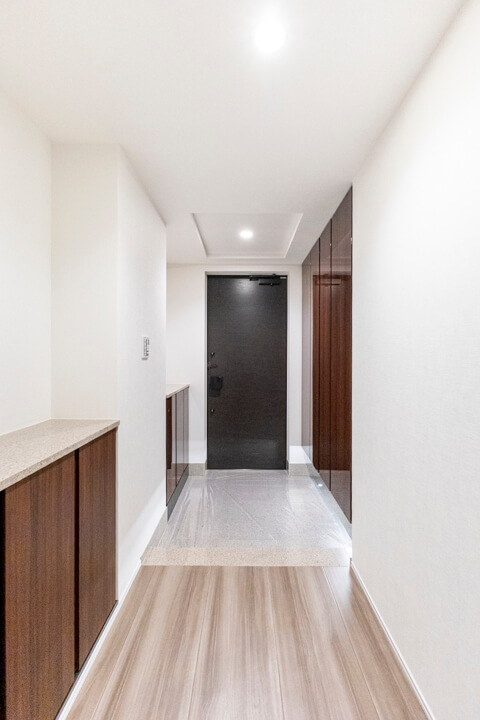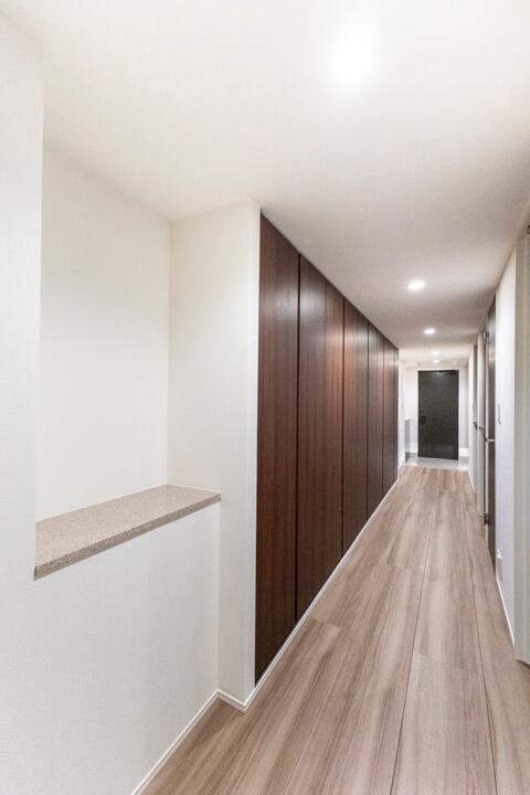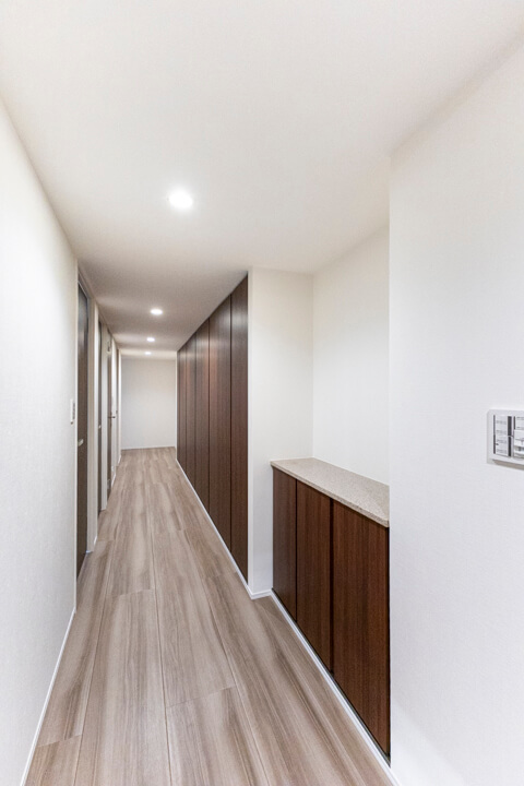 大容量の収納が並ぶ、玄関・廊下。自由度の高い可動棚で、靴だけでなく、日用品ストックやペットグッズ、アウトドアグッズなどをたっぷり収納できます。すっきりとした居住空間を実現できそうですね。カウンタースペースにはお花や小物を飾っても素敵です。照明には人感センサーが搭載されているので、いつも明るく出迎えてくれますよ。