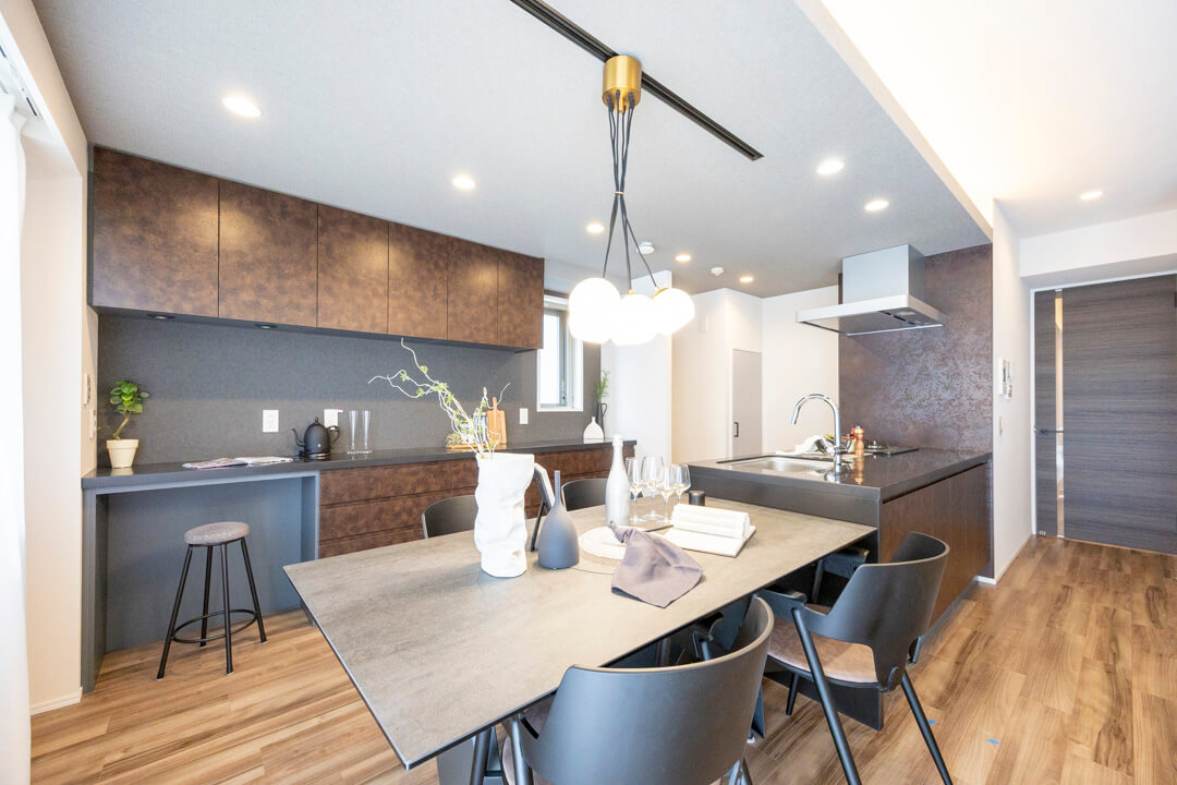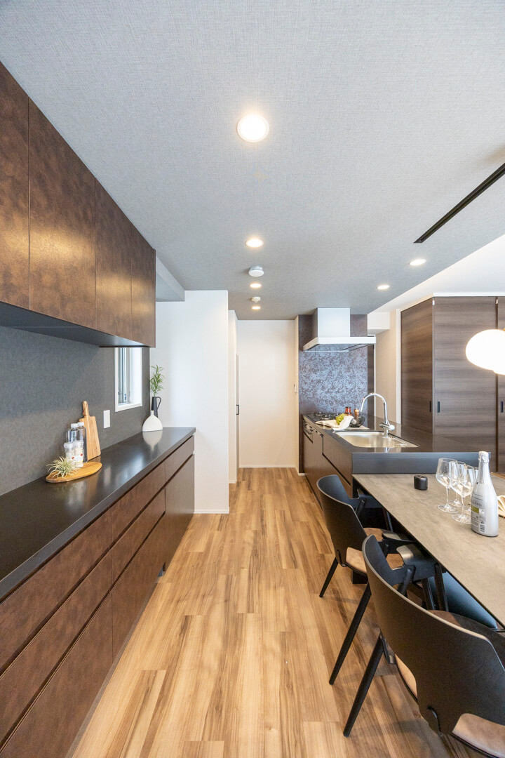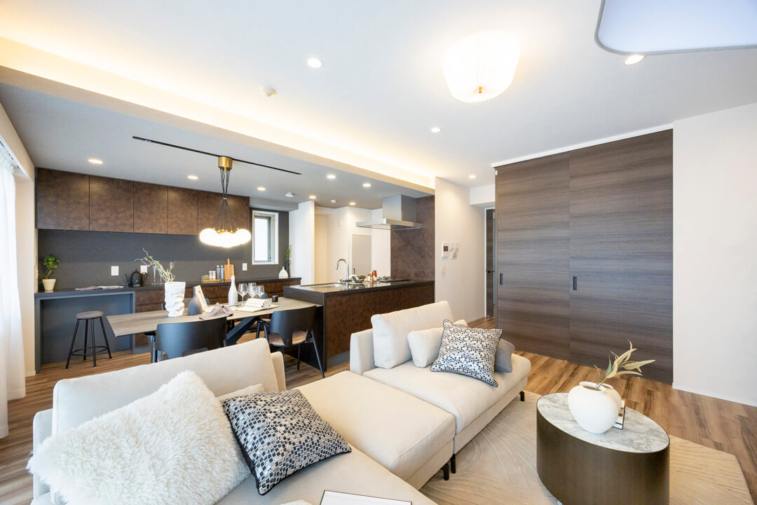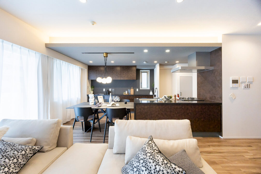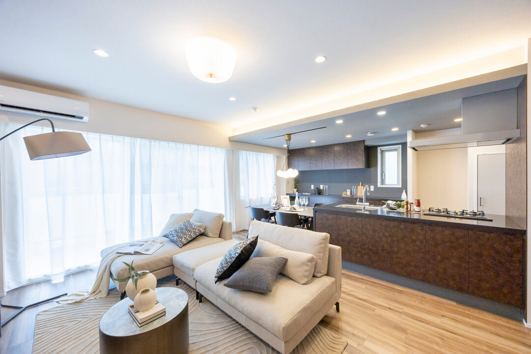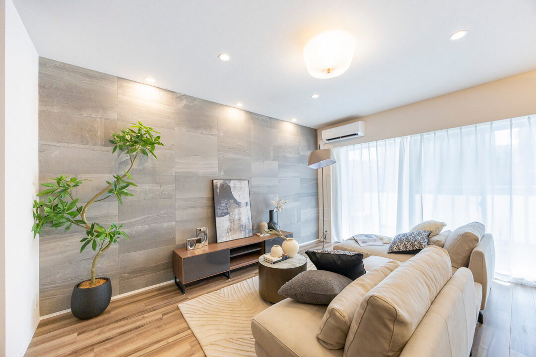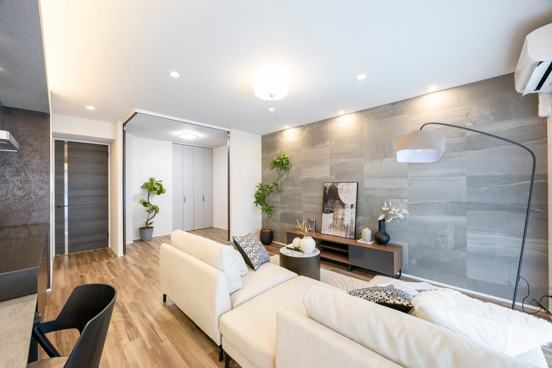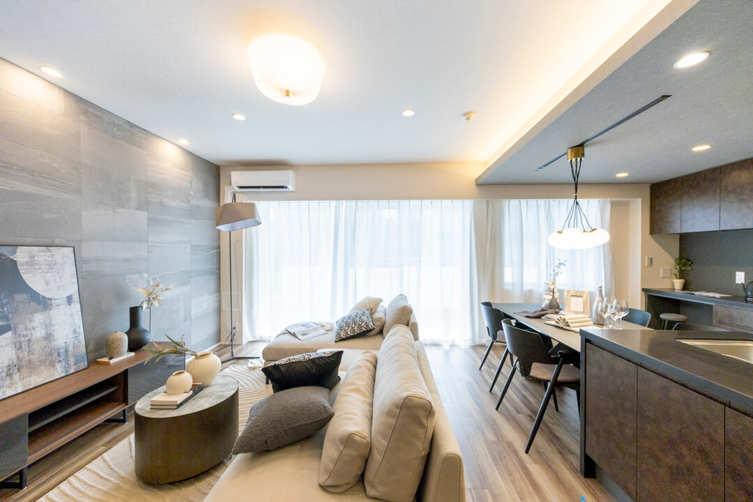 約16.1帖の広々としたリビングダイニングキッチンです。南東向きに窓があり、日当たり・通風が良好。天井には間接照明、壁面にはグレートーンのアクセントウォールがあしらわれていて、お部屋は上品な雰囲気に包まれています。