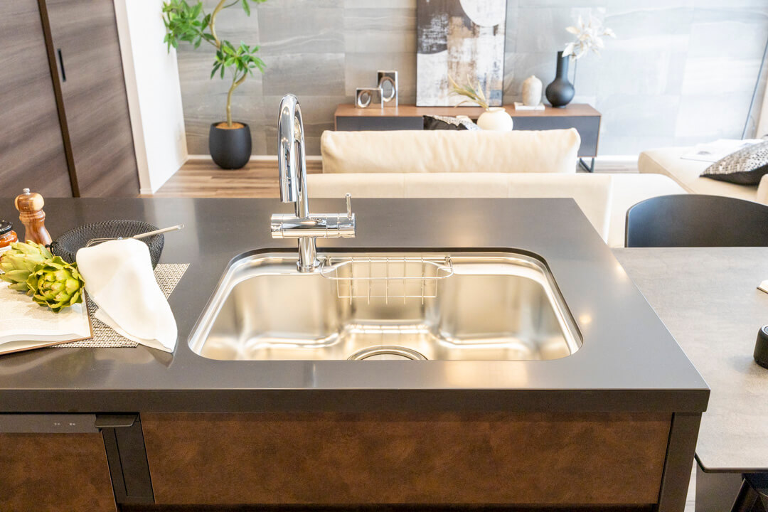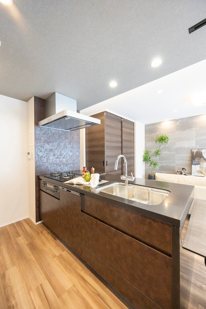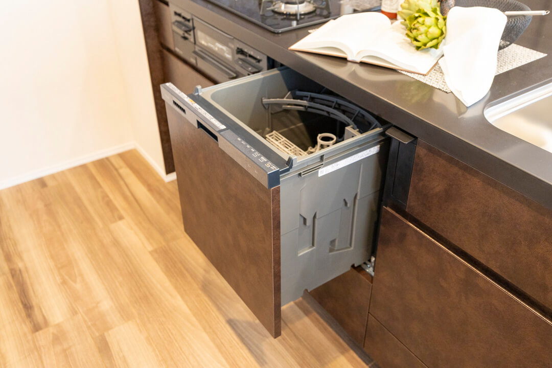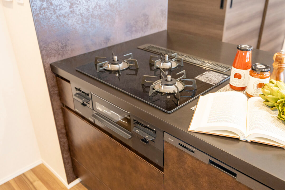 3口コンロ、グリル、食洗機付きと設備面も充実しています。シンクも広々としているので野菜などが洗いやすそうですよ。