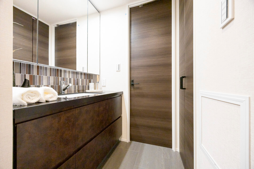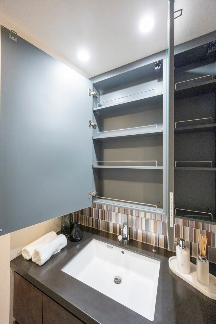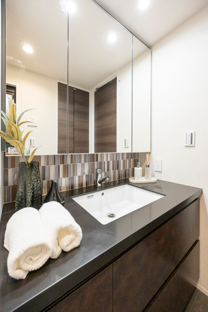 タイルがアクセントになっている洗面化粧台です。三面鏡の中に化粧品などが収納できて使い勝手良好。背面側には棚が造られているので、リネン類や着替えなどもすっきりと収納することができます。