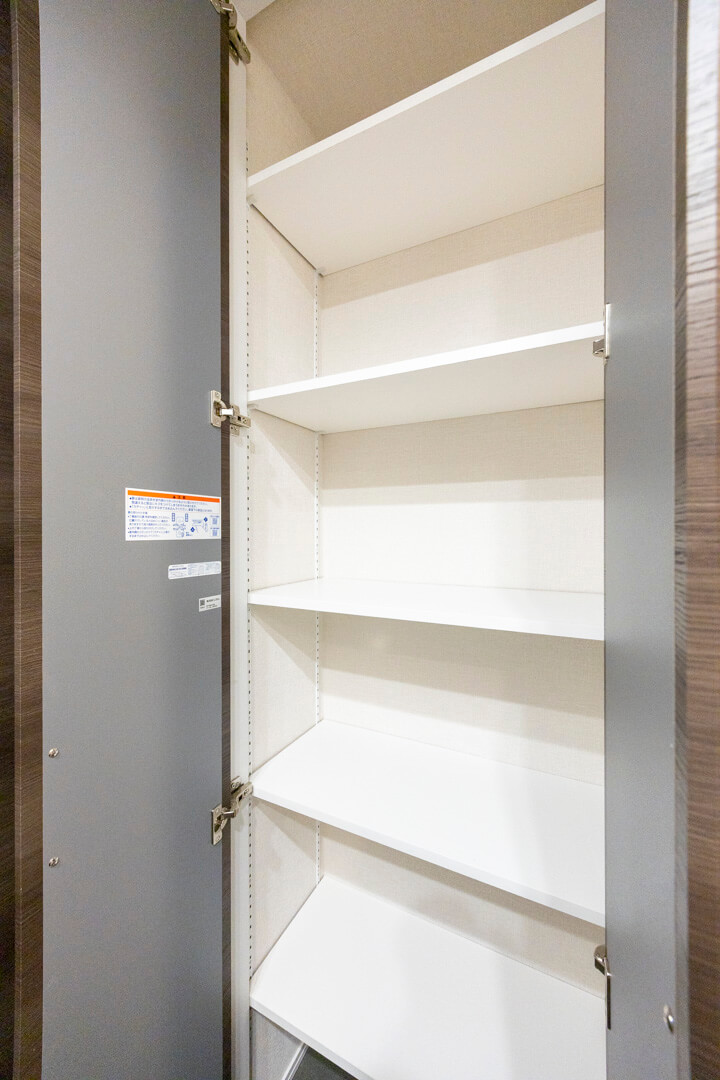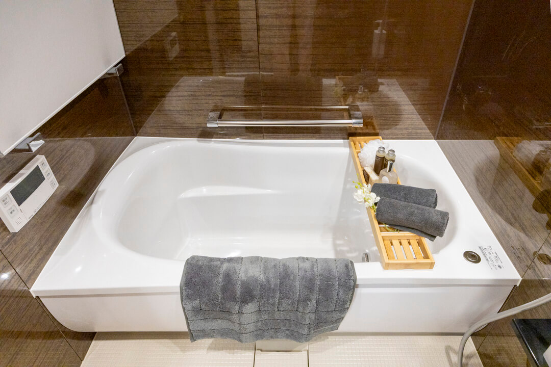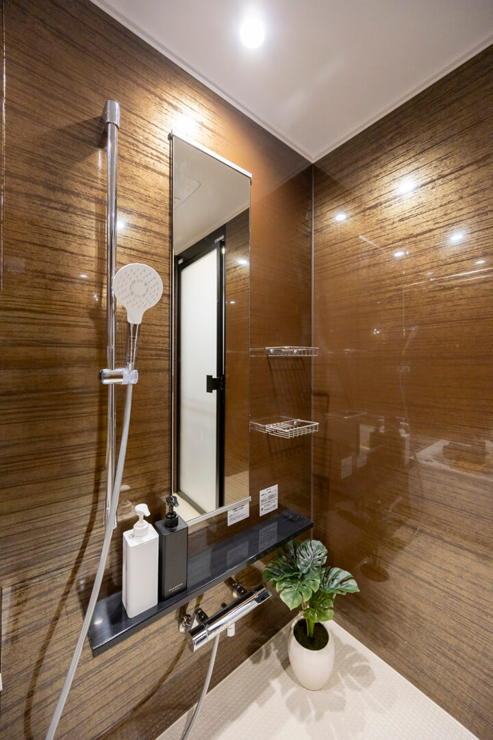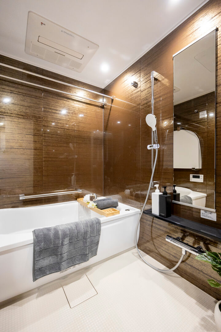 ブラウンの壁パネルが落ち着いた雰囲気を演出してくれている浴室です。お風呂にゆっくり浸かるのが好きという方に嬉しい追い焚き機能を搭載。家族の入浴時間がずれてしまっても安心です。また、浴室乾燥機には暖房・乾燥・換気・涼風の機能がついており、一年中快適に過ごすことができます。