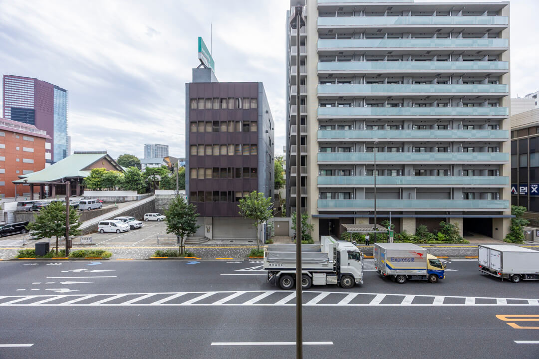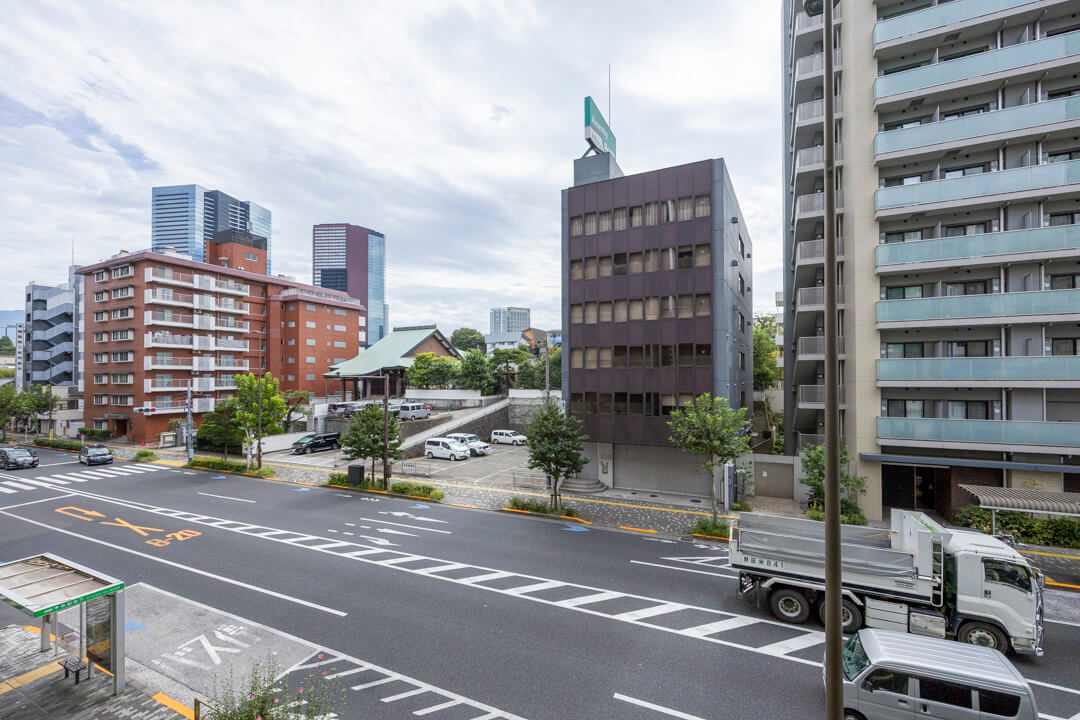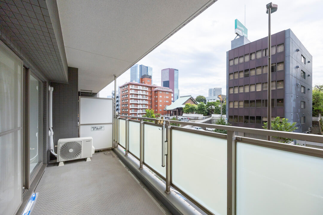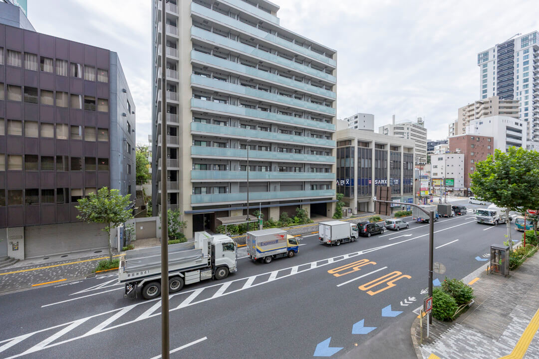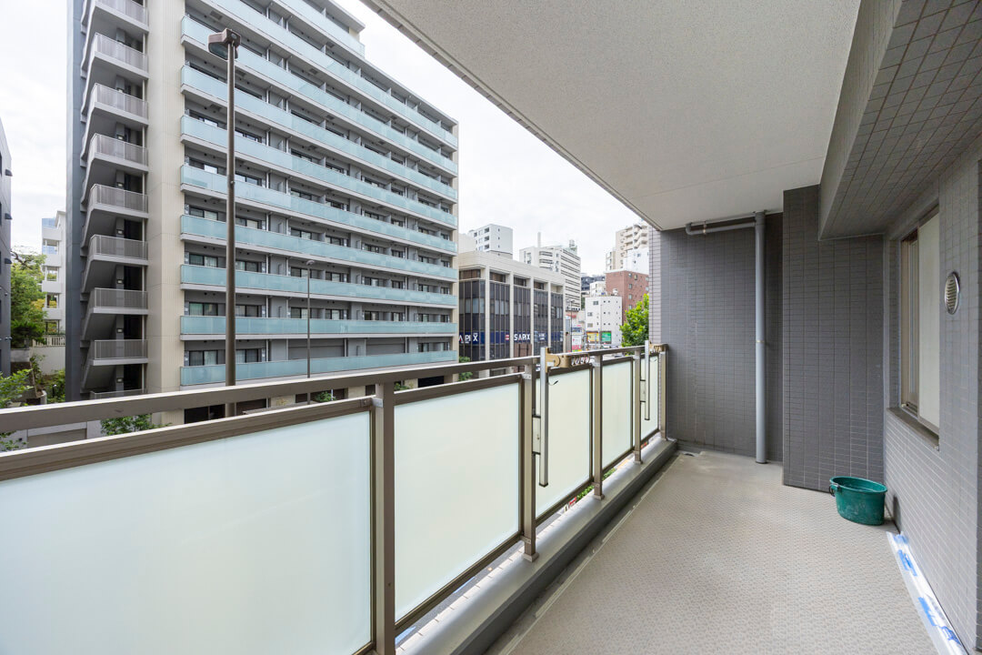 約15.79㎡のゆとりのあるバルコニーは、南東向きのため日当たりが良好。チェアを置いてほっと一息付けるくつろぎの空間にもなってくれそうです。また、洗濯金物が設置されているので、洗濯物も干しやすくなっています。目の前は桜田通りのため圧迫感のない眺望なのも◎。