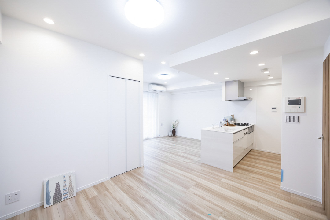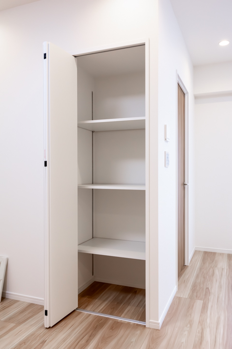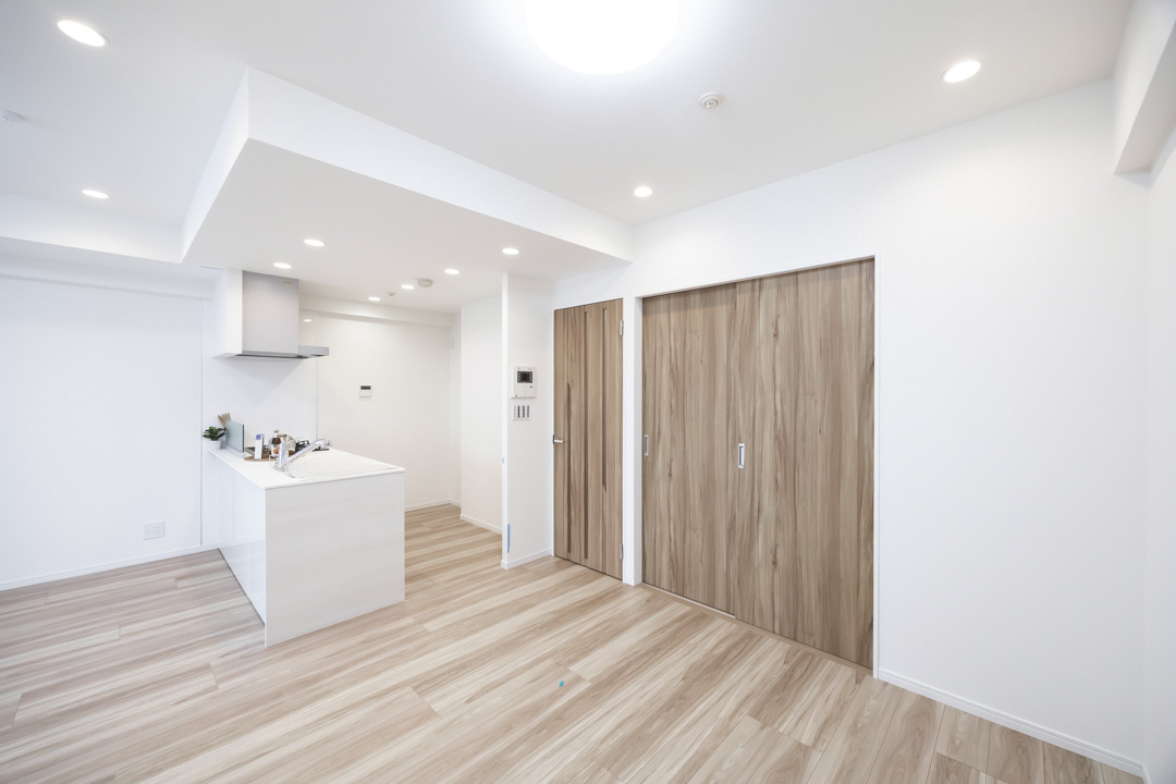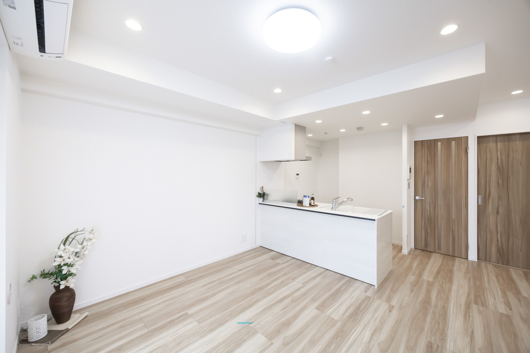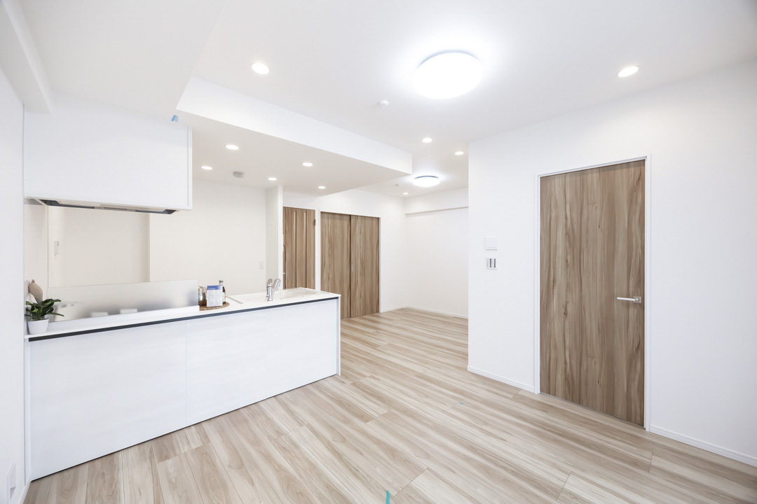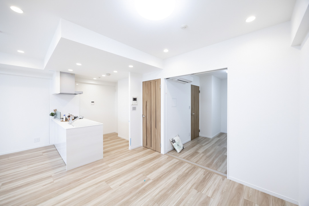 キッチンスペースを含め、約14.6帖のLDK。リビングとダイニングスペースがさりげなくゾーニングされている間取りが特徴的です。自然な光が入る南向きで、バルコニーも付いています。また、各洋室はリビングから直接出入りできる動線で、家族とのコミュニケーションが取りやすくなっています。約5.0帖の洋室は、扉の開口部が広く取られており、リビングと繋げてより広々と過ごせます。リビングの一角に生活雑貨の整頓に便利な収納スペースも備わっています。