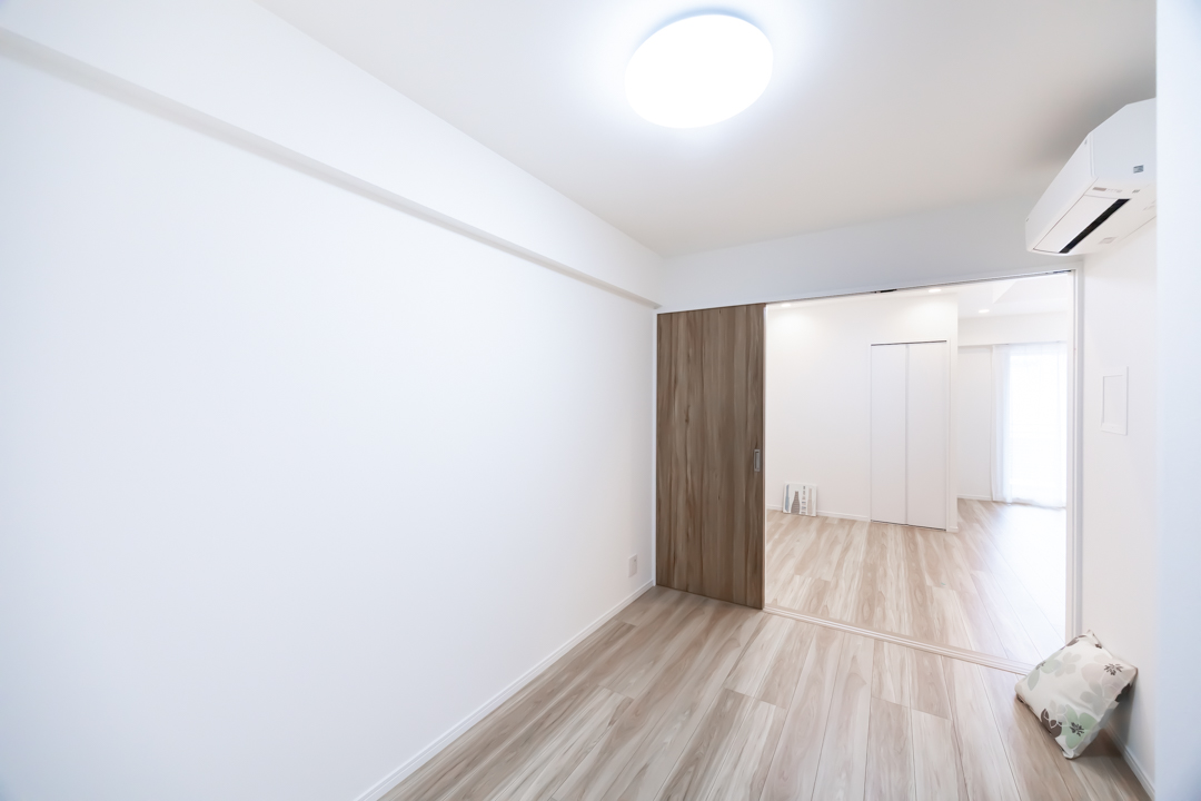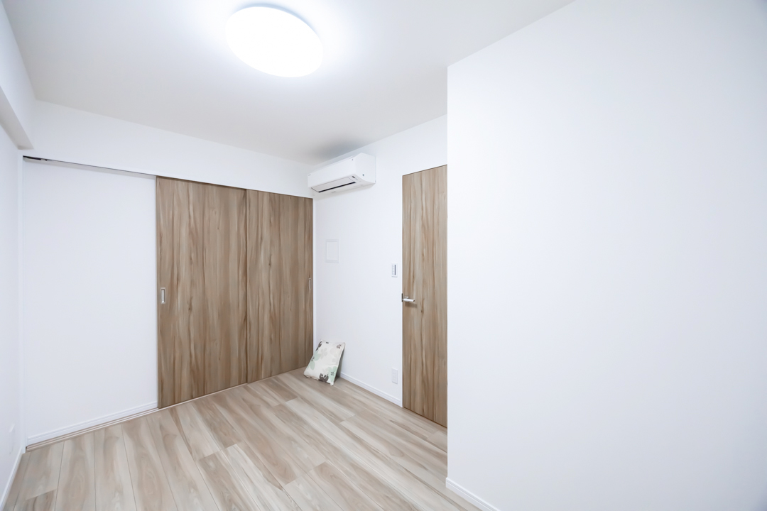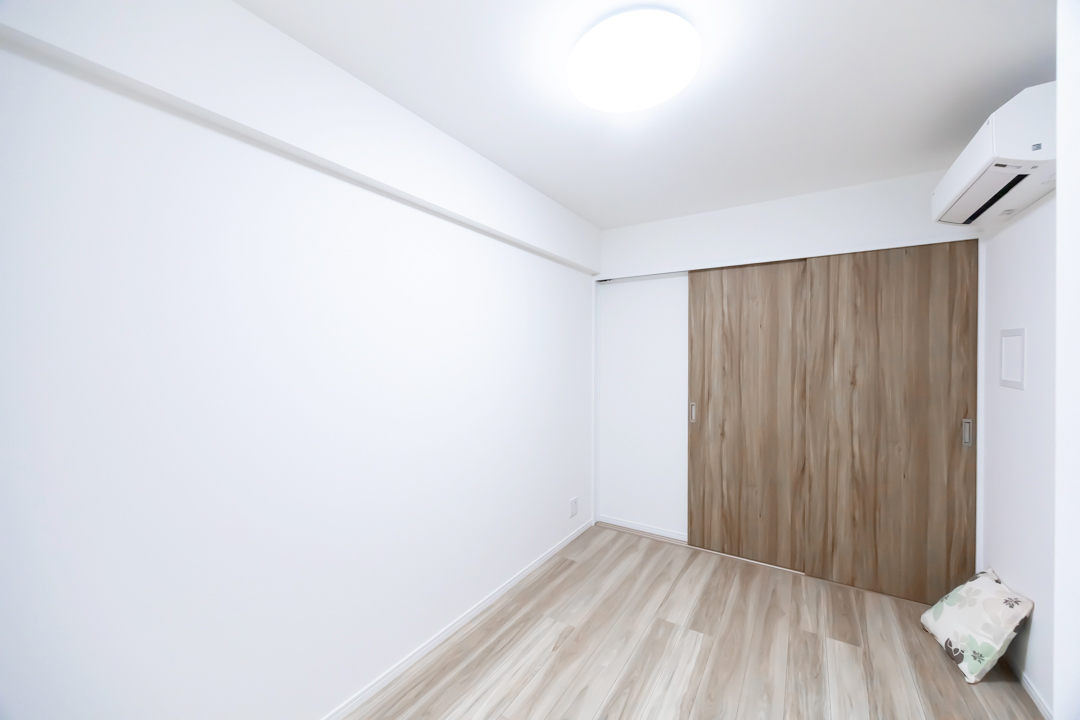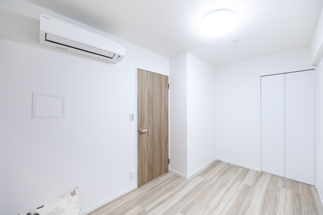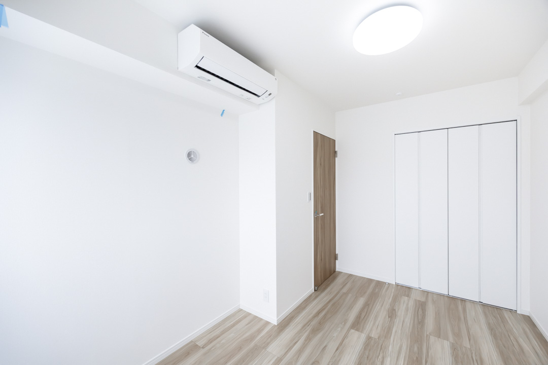 約5.0帖の洋室。ドアの開口部が広く取られており、扉を全開にしてより広々と過ごせます。エアコン、クローゼットも完備。廊下からも出入りできる便利な動線です。