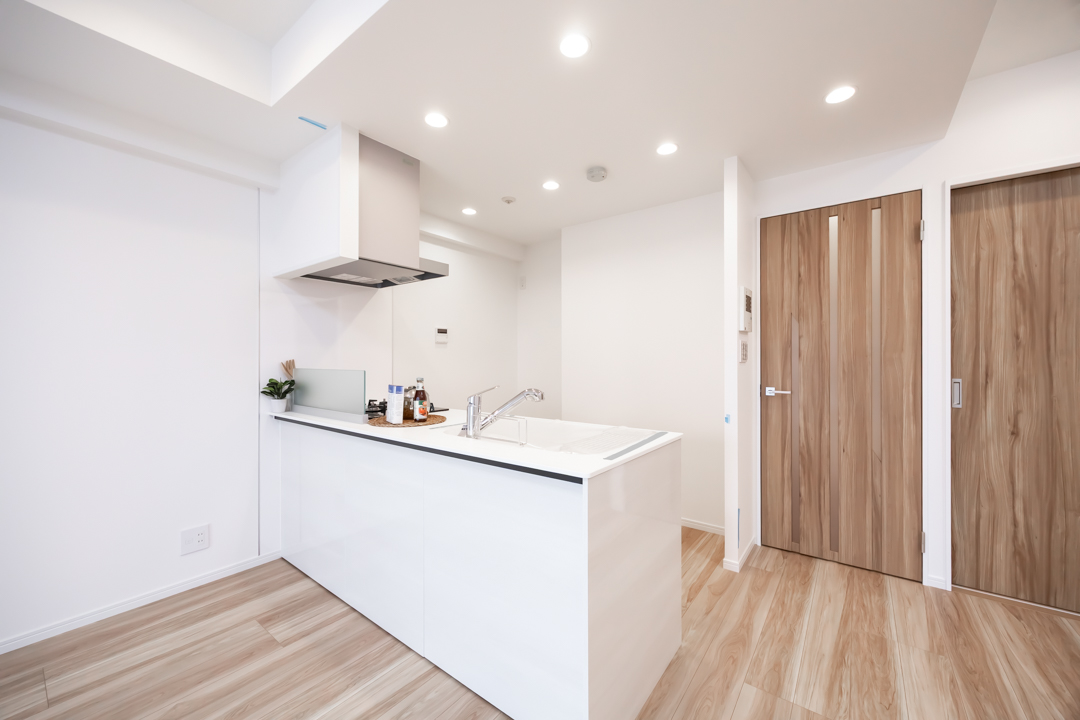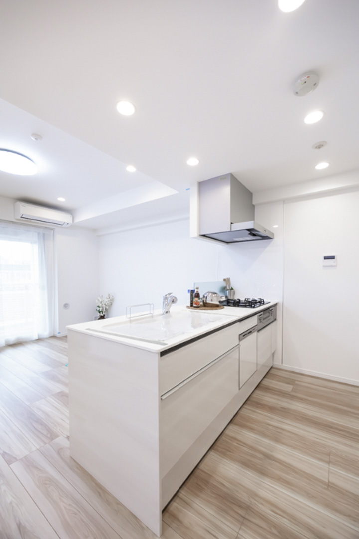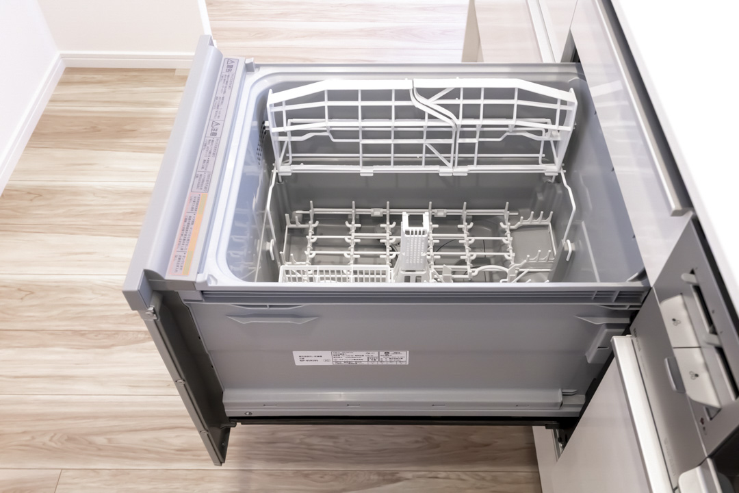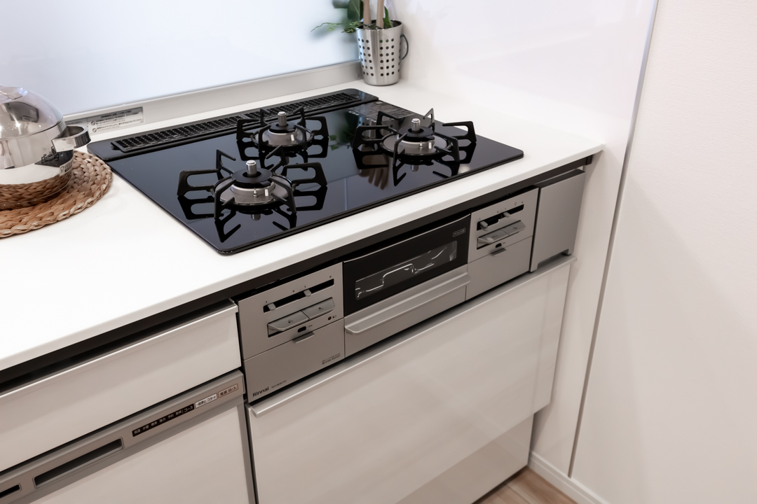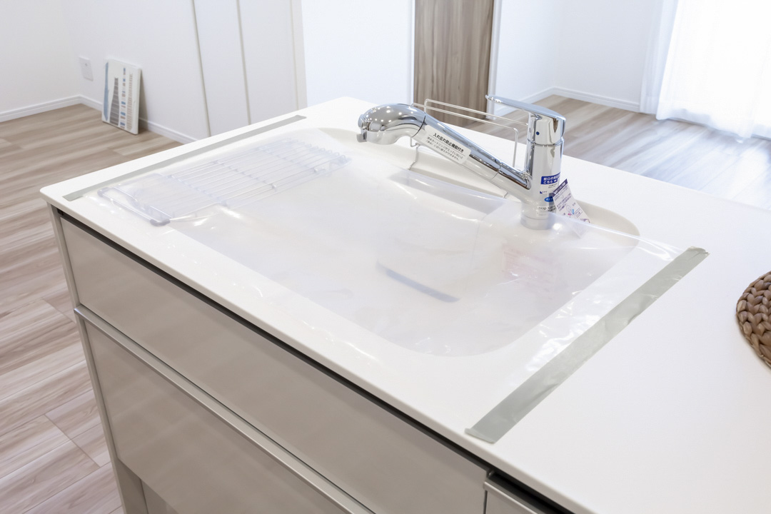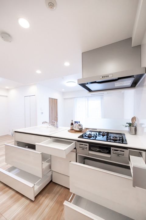 リビングダイニングを見渡せる開放的なオープンキッチン。家族やゲストとコミュニケーションが取りやすく、小さなお子さんがいるご家庭では子どもの姿も見守れます。料理が捗る3口ガスコンロ、家事の時短に心強い食洗機付きで設備も充実。モノの出し入れがしやすい引き出し式のキャビネット付きで使い勝手の良さもポイントです。