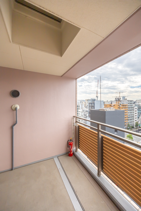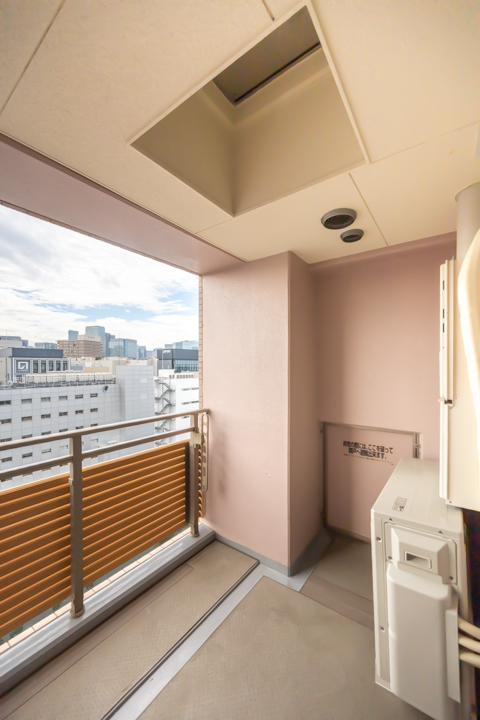 リビングダイニングに面したバルコニー。約5.60㎡ほどの広さです。南向きで陽当たりも良好。10階部につき眺望も良好です。