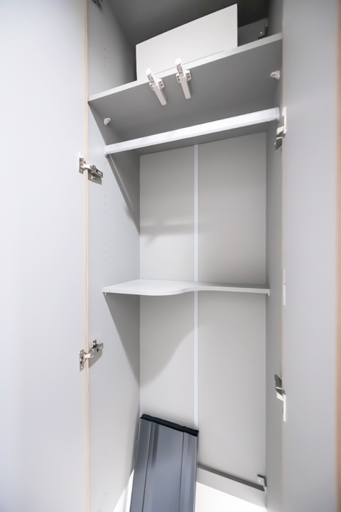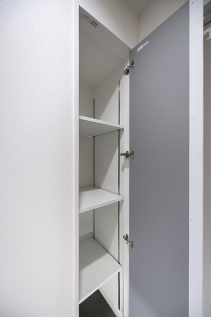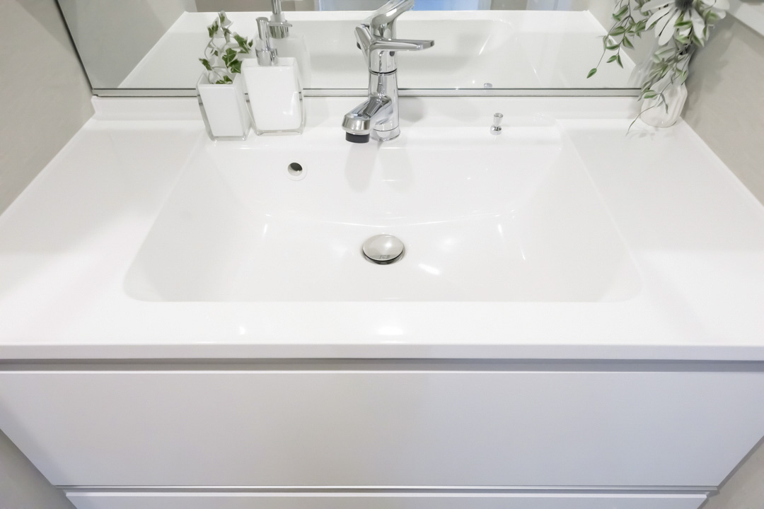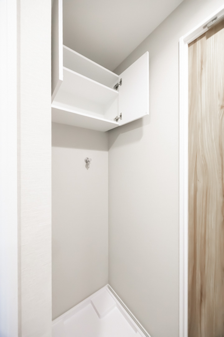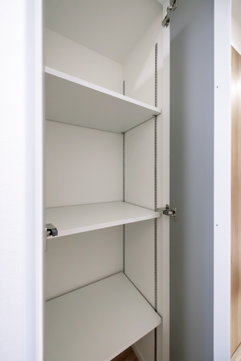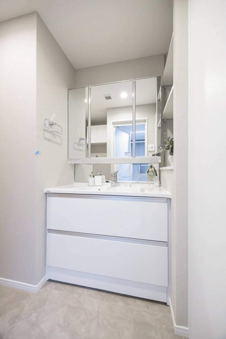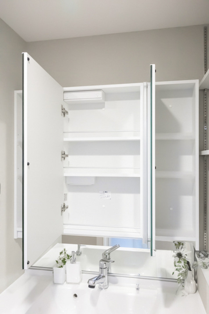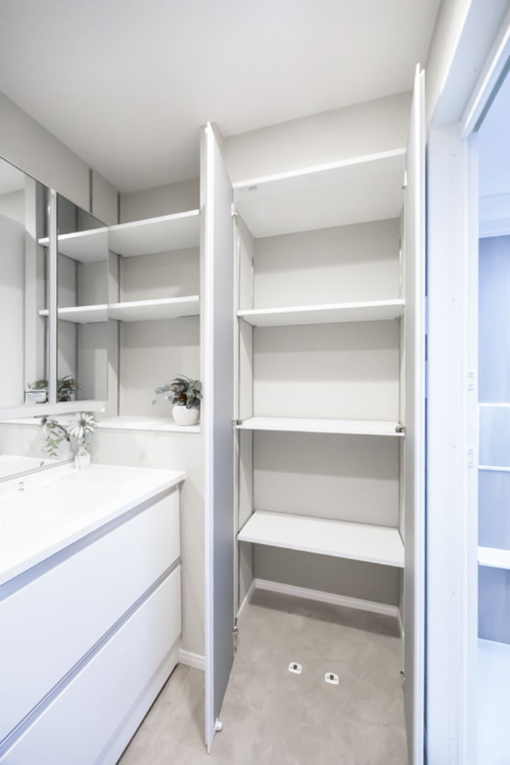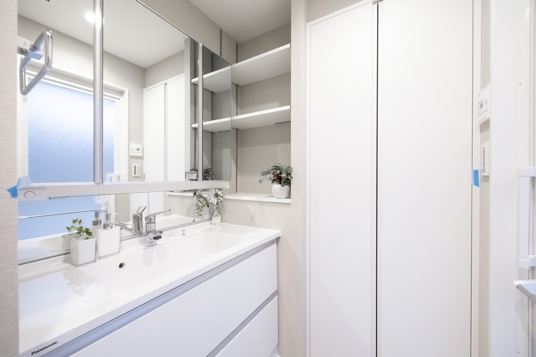 洗面化粧台は洗面まわりの小物がすっきり整頓できるミラーボックスや、モノの出し入れがしやすい引き出し式のキャビネット付きで使い勝手の良さもポイント。別途、リネン庫も設置されていて、収納スペースが充実しています。