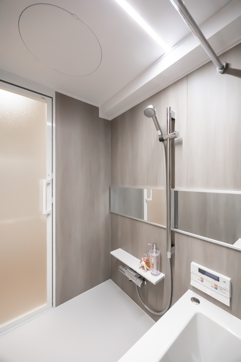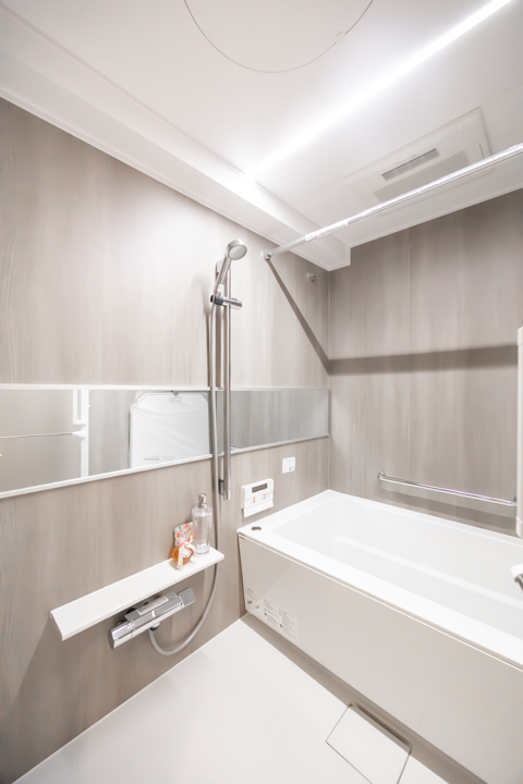 ウッド調であたたかみのある雰囲気のバスルーム。追い炊き機能の他、乾燥・換気・暖房・涼風の4つの機能が備わっており、一年中快適にバスタイムが楽しめます。浴室照明は色の切り替えが可能。白っぽい光、オレンジっぽい光、気分に合わせて色の切り替えが可能です。また、ランドリーパイプ付きで雨の日や冬場の洗濯にも困りません。