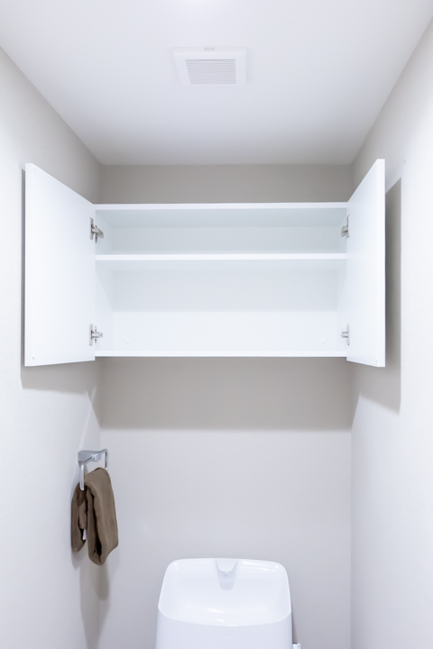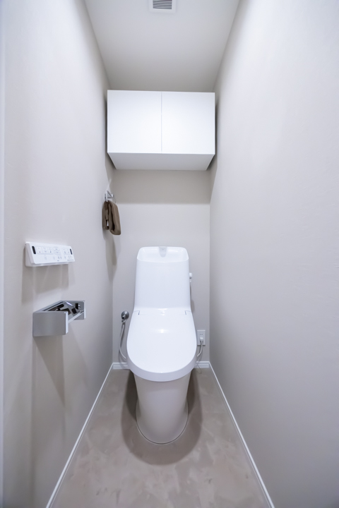 廊下に面したレストルーム。手洗いタンク付きのトイレを採用。ウォシュレット、収納スペースも備わっています。