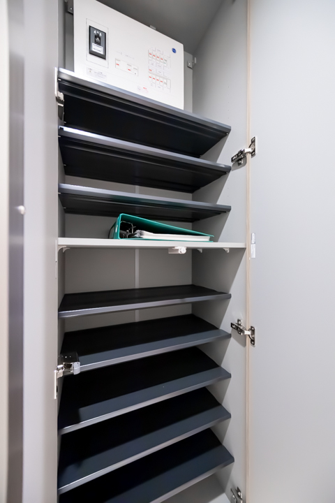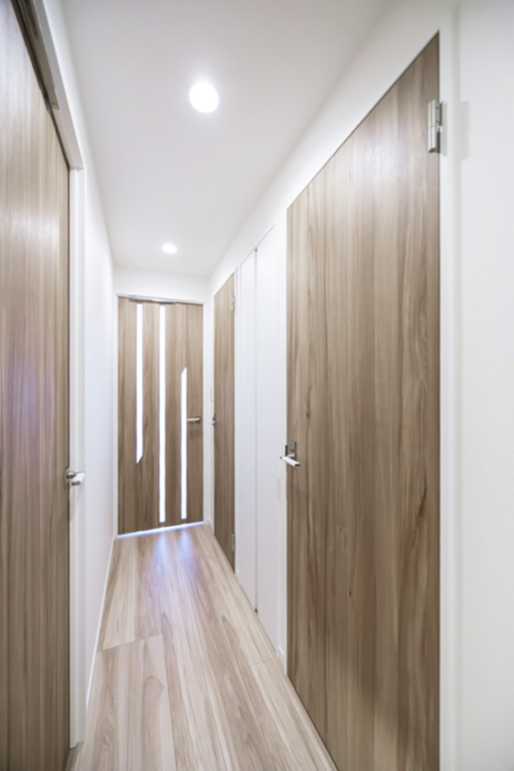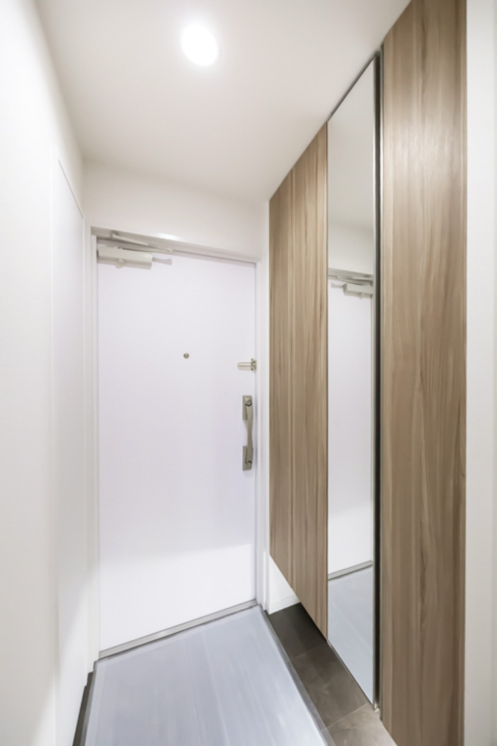 玄関には天井まで高さのあるシューズボックスを完備。足元をやさしい光で照らしてくれるフットライト付です。扉の一面が姿見になっていて、お出かけ前の身だしなみチェックにも便利。また、玄関照明は自動センサーへの切り替えが可能で、帰宅時に明るい空間で出迎えてくれます。電気の消し忘れも防げますね。