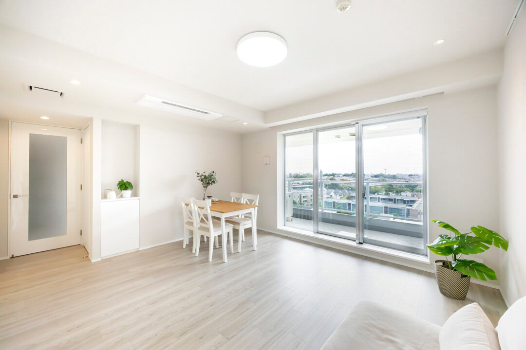 約15.6帖の広々としたリビングダイニングキッチンです。南東向きのため日当たりが良好、バルコニー越しに抜け感のある眺望が広がっています。また、壁面にはピクチャーレールが設置されているので、絵画やグリーンを飾ることもできますよ。