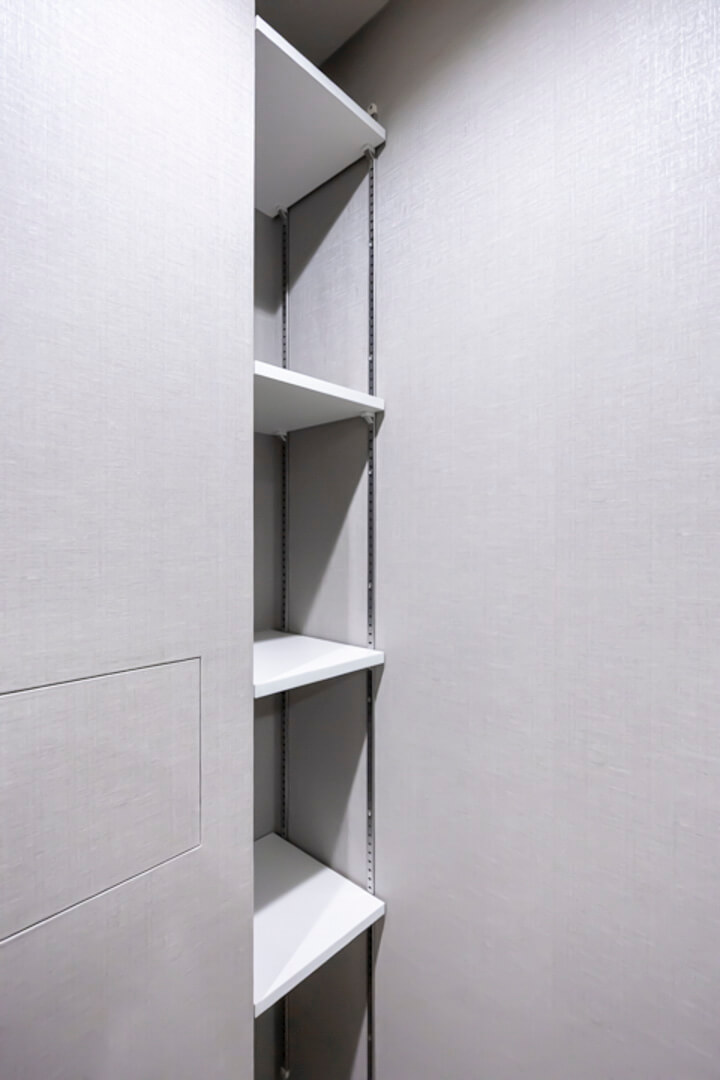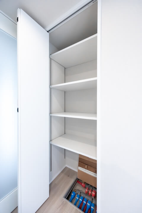 入口には生活感が出がちな小物をすっきりと収納できる棚が造られています。