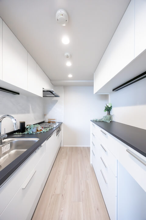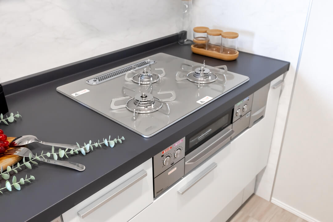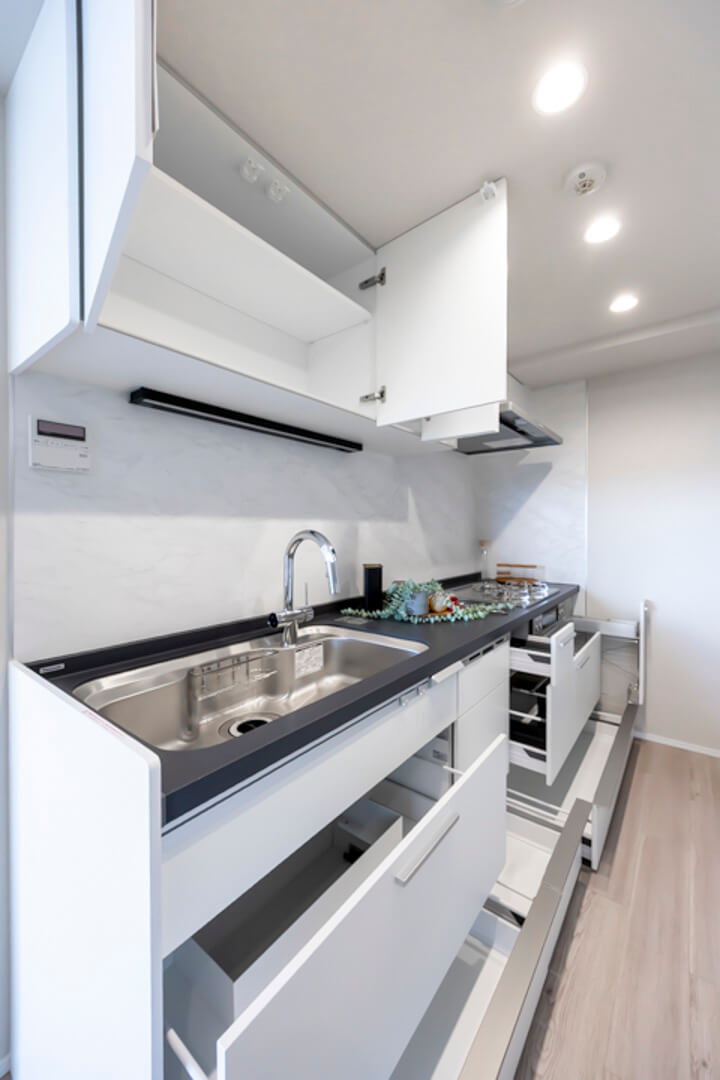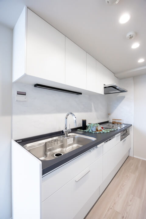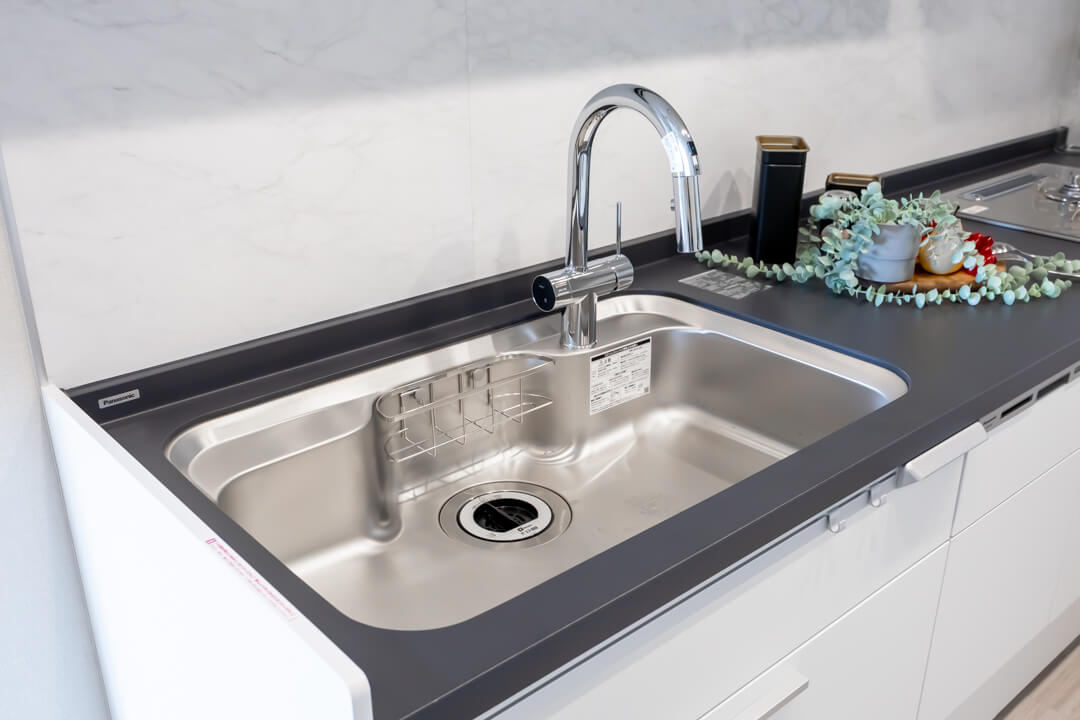 3口コンロ、グリル、ディスポーザー、浄水器、食洗機付きで設備面も充実しています。シンクも広々としているので野菜などが洗いやすそうですよ。