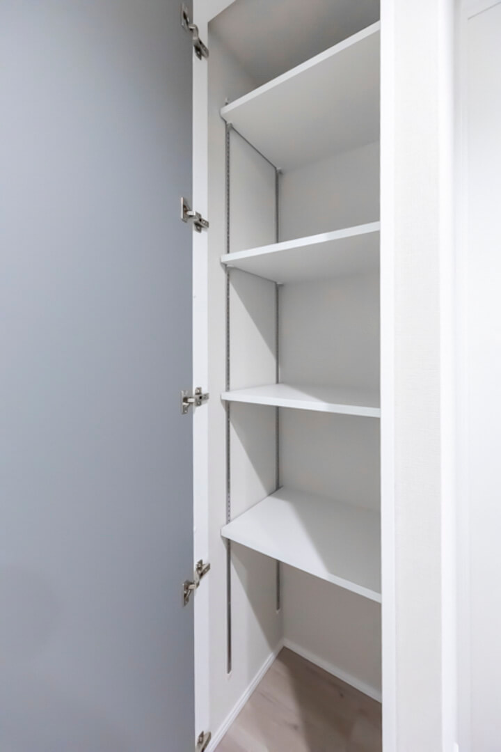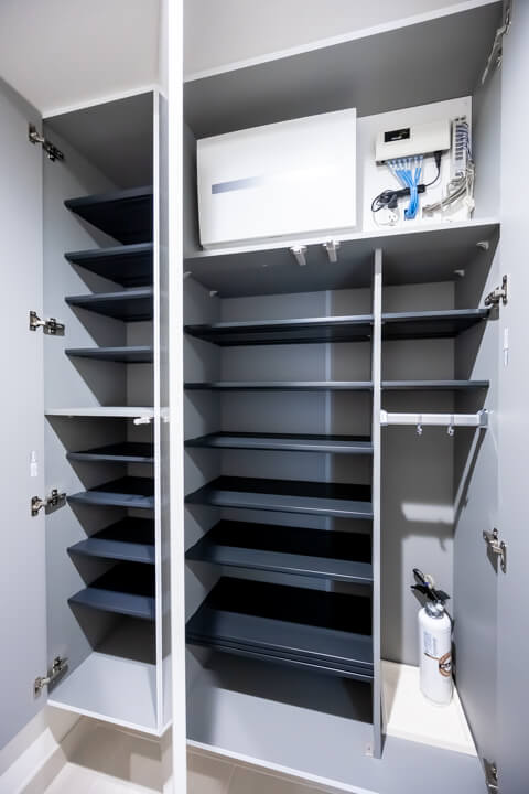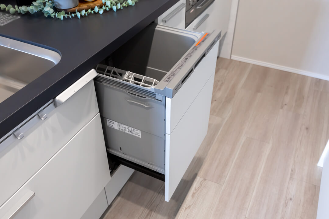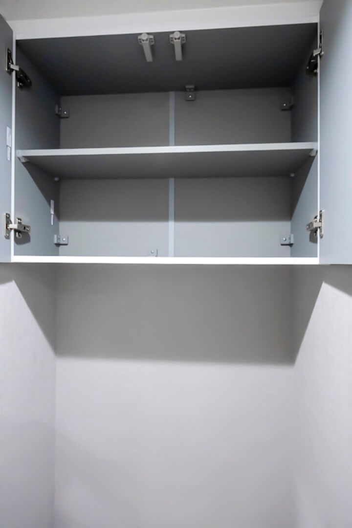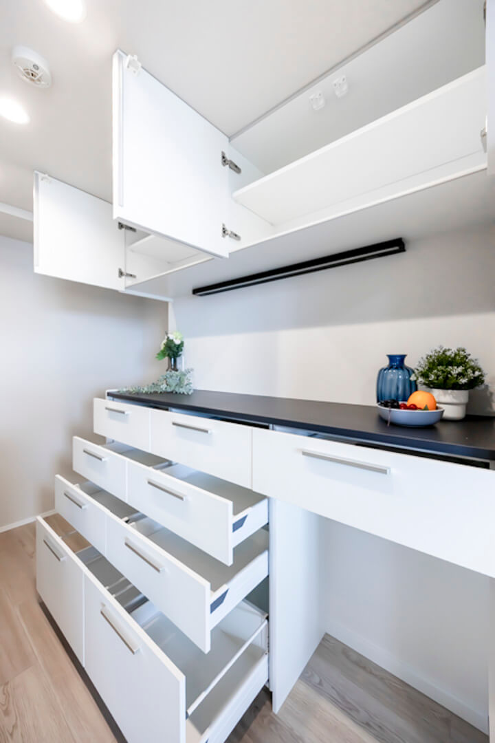 キッチンの背面側にはカップボードが備え付けられています。調味料や食器などを収納できるだけでなく、電子レンジなどを置くこともできるので便利です。