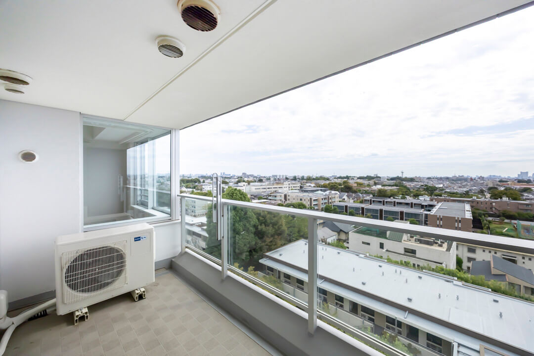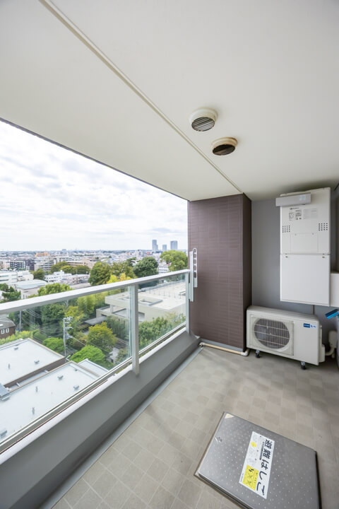 約8.31㎡のバルコニーは、南東向きのため日当たりが良好です。9階部分ということもあり、目の前には開放的な眺望が広がっています。洗濯金物が設置されているので、洗濯物も干しやすそうです。
