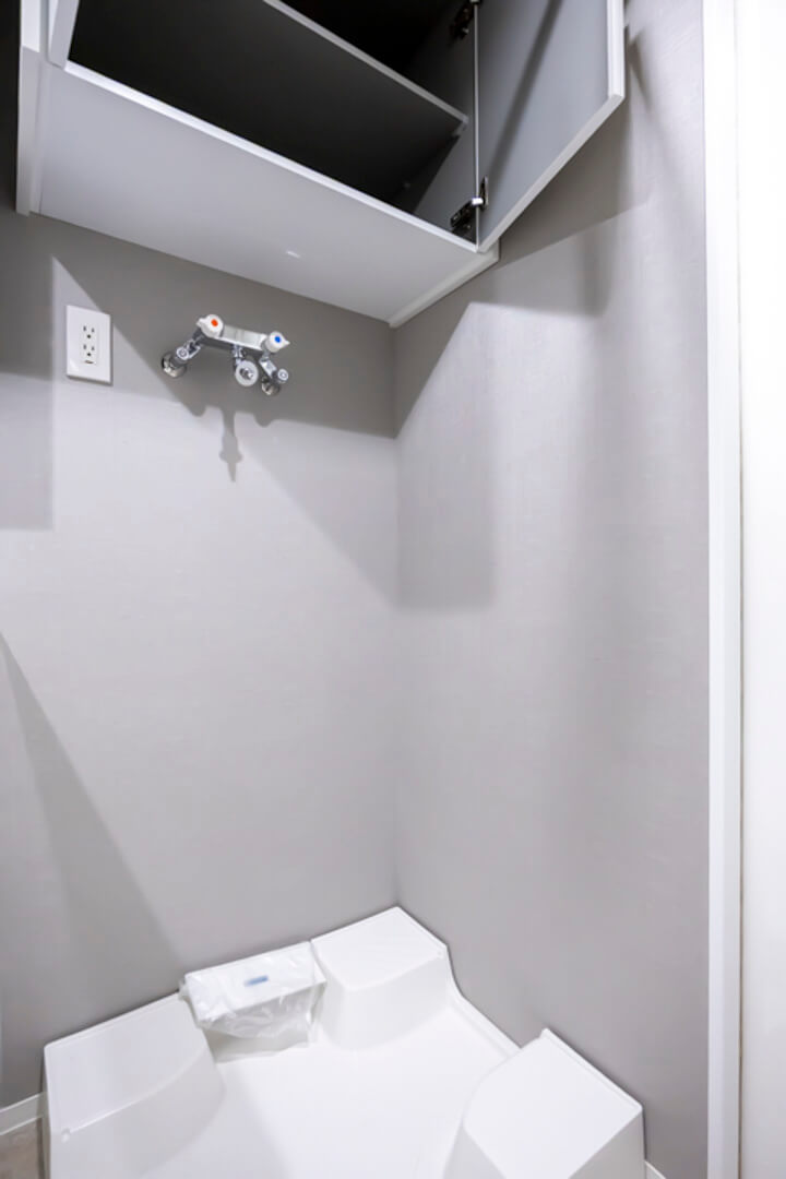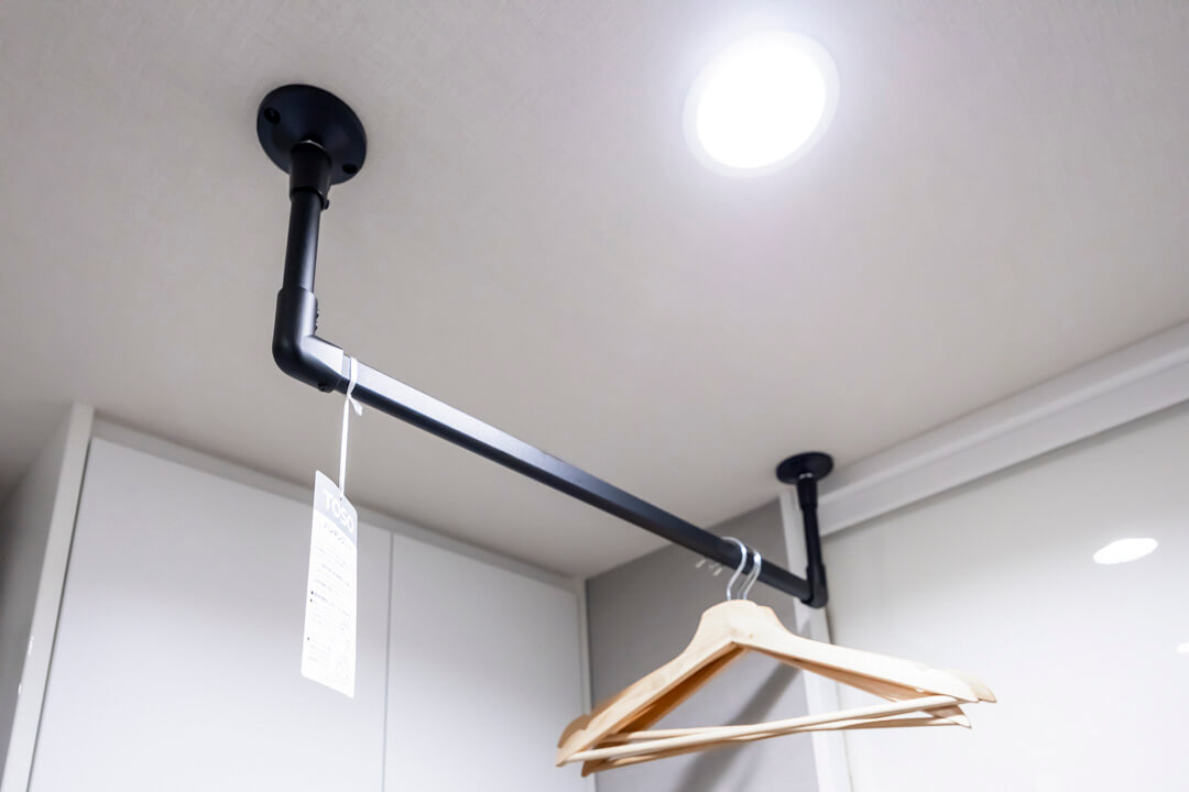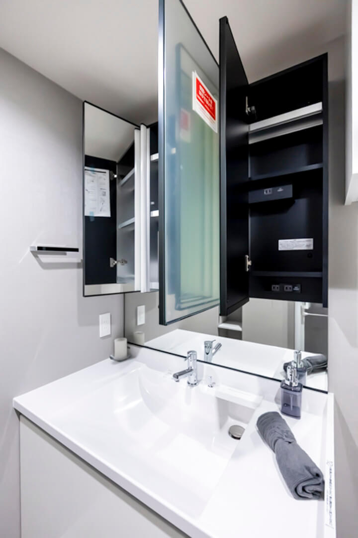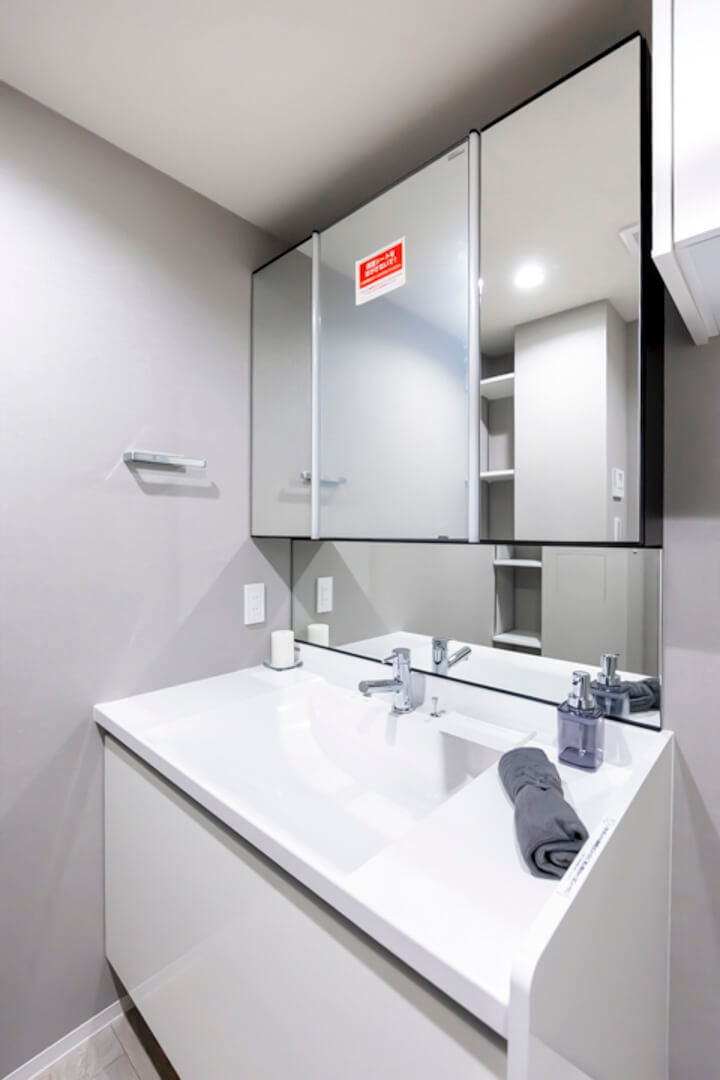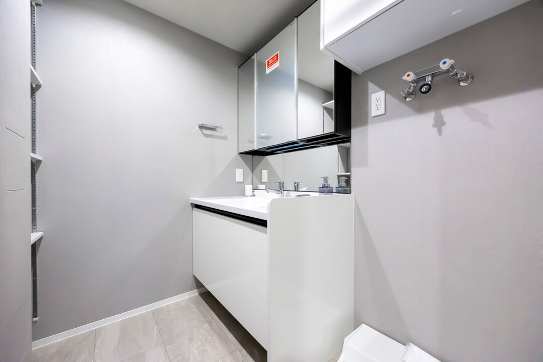 スタイリッシュな印象の洗面化粧台です。三面鏡の中に化粧品などが収納できて使い勝手良好。照明は縦に配置されているため、顔に影をつくりません。また、背面側には可動棚があるので、リネン類などを置くこともできますよ。さらに、天井にはハンガーパイプが設置されており、雨の日の洗濯物にも便利です。