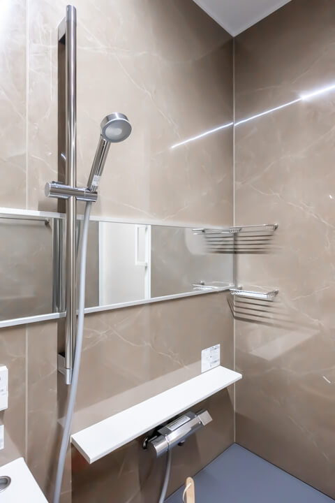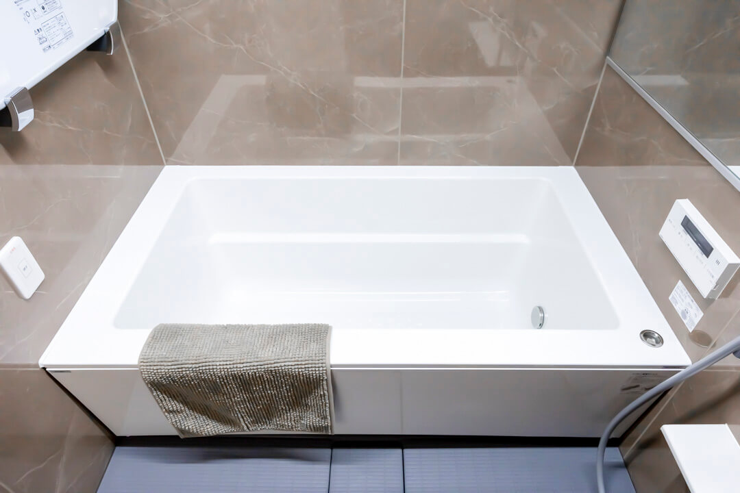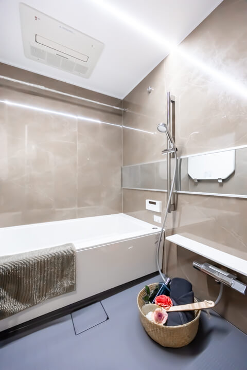 石目調の壁パネルで高級感があるバスルームです。お風呂にゆっくり浸かるのが好きという方に嬉しい追い焚き機能を搭載。家族の入浴時間がずれてしまっても安心です。また、浴室乾燥機には暖房・乾燥・換気・涼風の機能がついており、一年中快適に過ごすことができます。