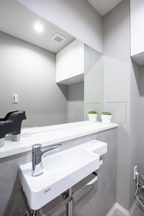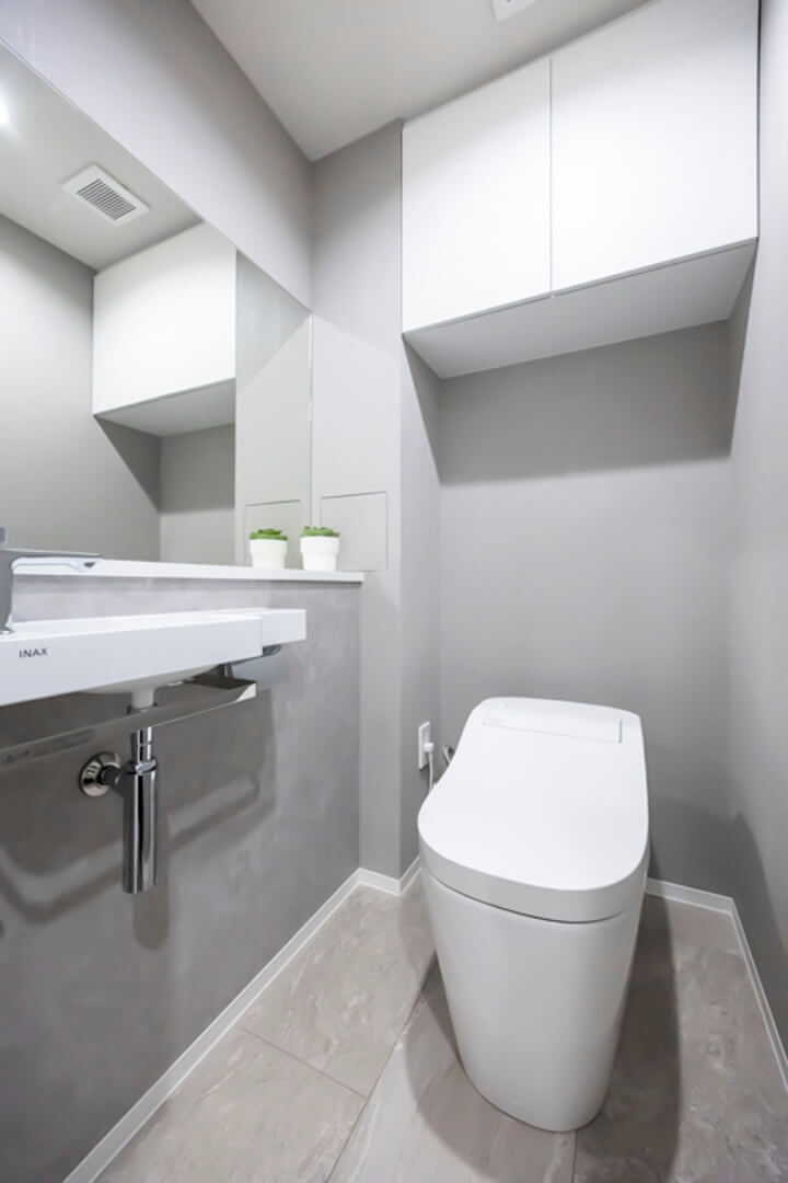 ウォシュレット一体型のトイレです。タンクレスタイプなのですっきりとした印象に。また、別途で手洗い器と鏡が造られているので、その場でサッと身だしなみを整えることもできますよ。上部には吊戸棚が設置されていて、収納スペースもあります。カウンタースペースにはアロマなどを置いても◎。