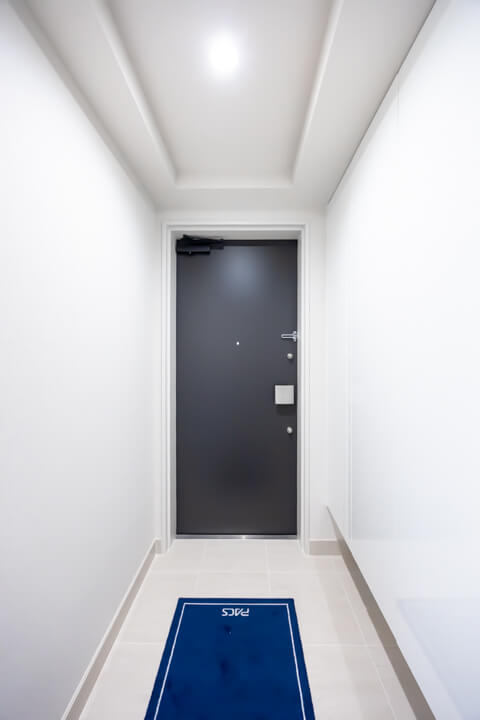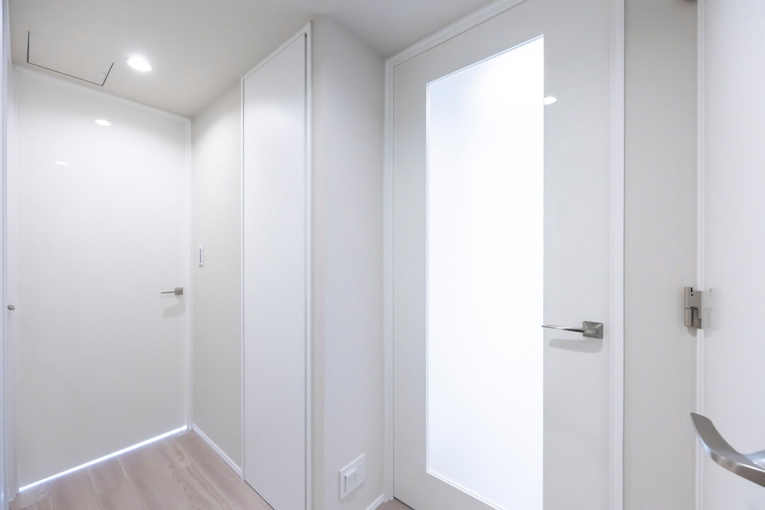 白を基調とした清潔感のある玄関です。シューズボックスは高さがありますが、フロートタイプのため空間に圧迫感を与えません。また、廊下にも収納スペースが造られていて◎。