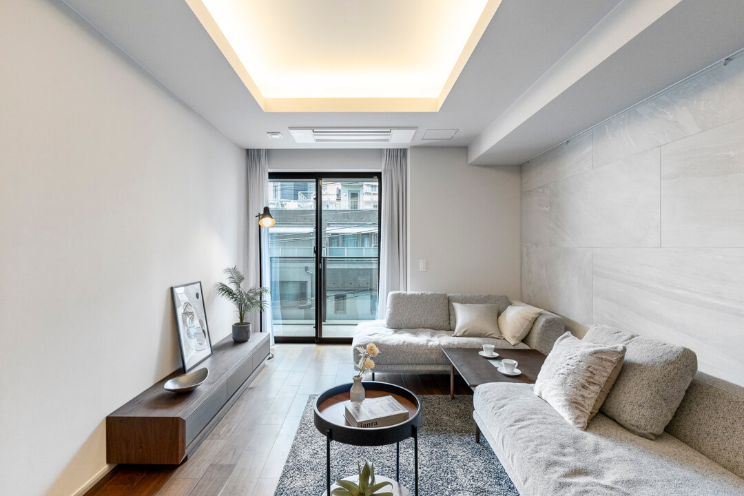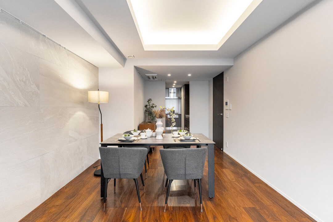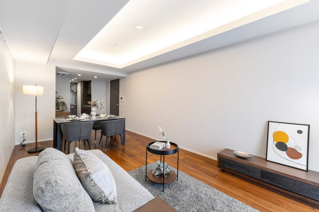 折り上げ天井には間接照明を設置。光のグラデーションが陰影を作り出し、落ち着いた雰囲気を演出します。柔らかな明かりがリラックスタイムへ誘ってくれそうですね。