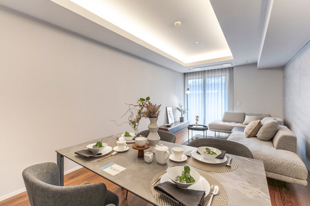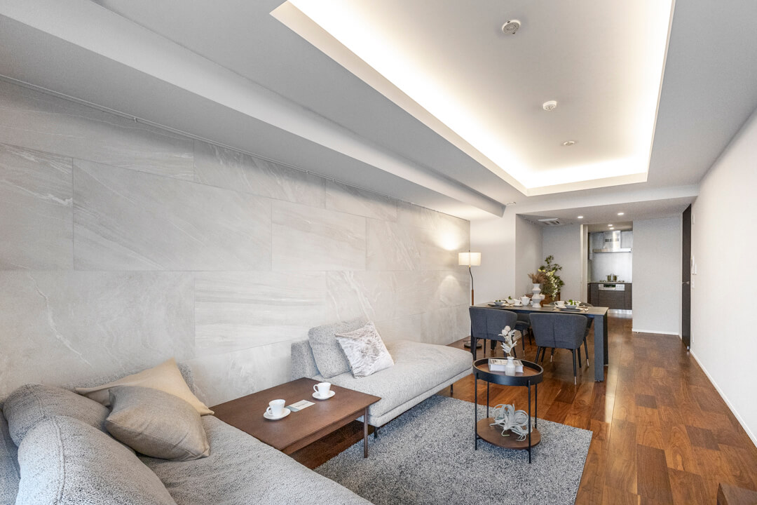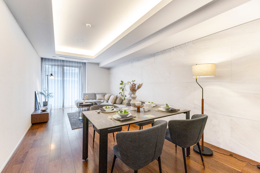 キッチンと合わせて約22.5帖のリビングダイニング。石目柄のアクセントタイルが洗練された空間を演出します。ピクチャーレールを活用し、絵画や植物を気軽に飾れるのもポイント。インテリア選びの楽しみが広がりそうです。