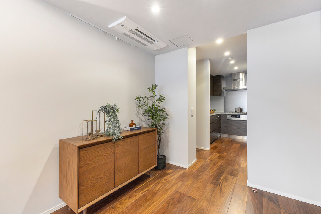 リビングダイニングには、寒い時期に重宝する床暖房が敷設されています。床全体がほぼ均一に温まり、陽だまりのような空間になりますよ。埃を舞い上げにくく、空気が乾燥しにくいのも嬉しいですね。直接火に触れたり、コードに絡まってしまうことがないので、小さなお子さまやペットがいても安心して使用できそうです。
