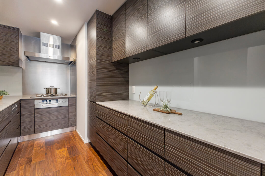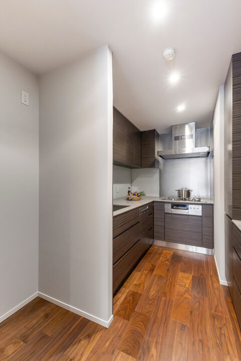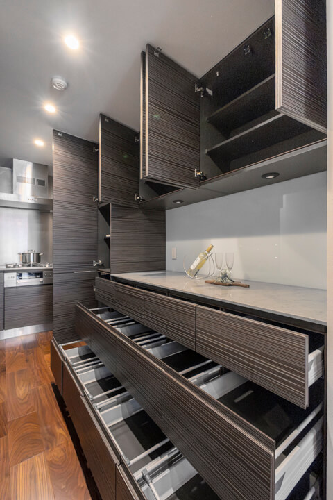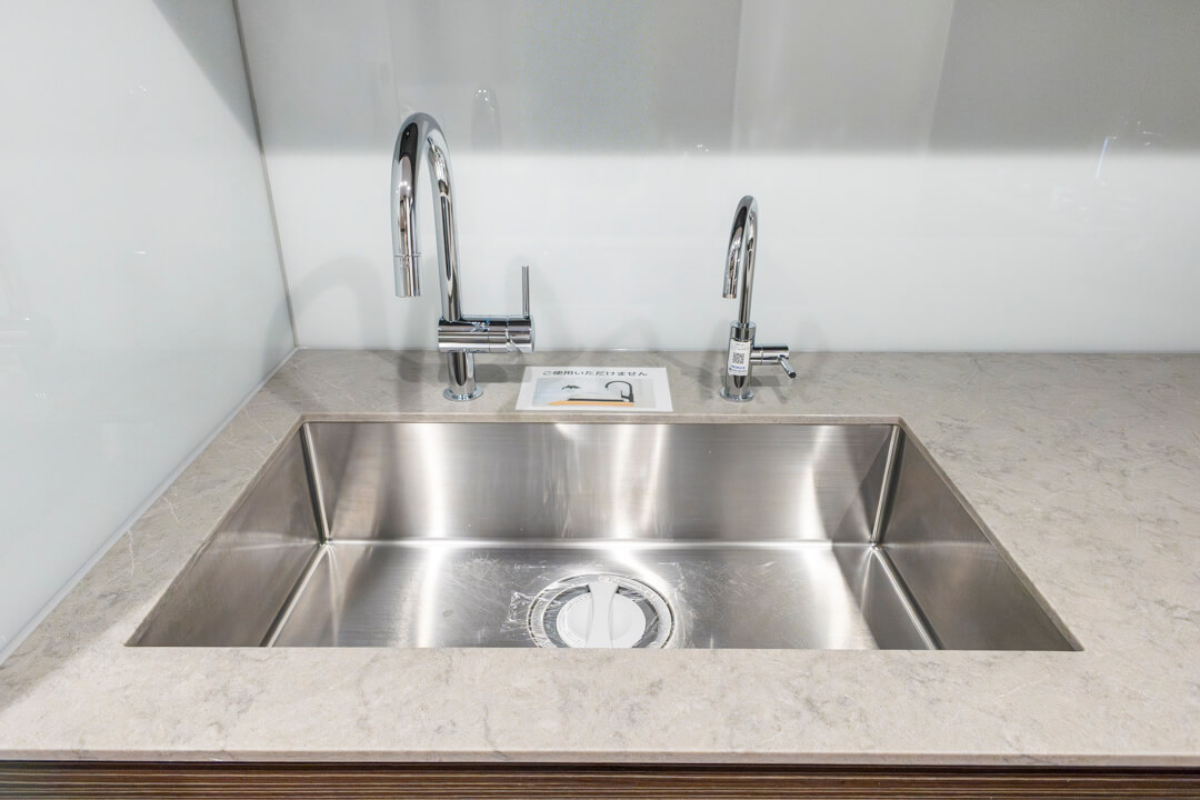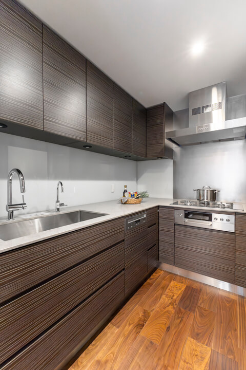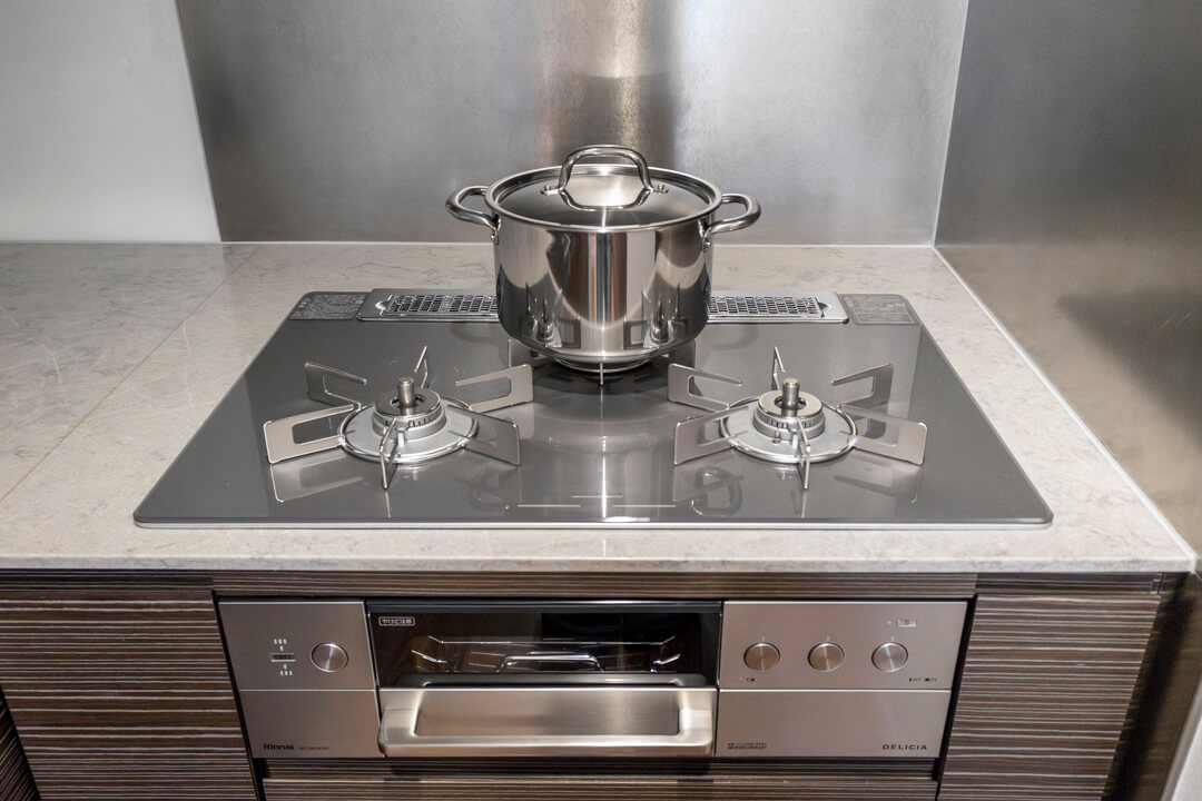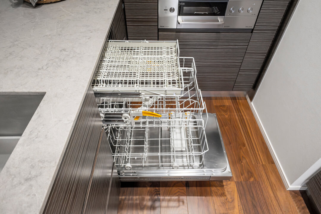 効率良く調理ができるグリル付3口ガスコンロや、後片付けの捗る食洗機を内蔵。食洗機は大容量で人気のMiele(ミーレ)製です。さらに、シンクにはディスポーザーが搭載さてています。料理後すぐに生ゴミを処理できるので、掃除の手間が軽減され、悪臭の原因を防いでくれますよ。